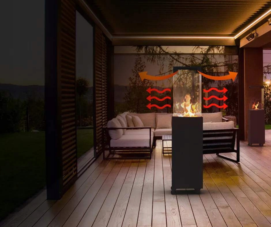 На відміну від більшості парасольок з обігрівом, які подають тепло лише вниз, обігрівач Faro випромінює теплі хвилі на двох рівнях: рівномірно з чотирьох сторін через скло та через отвори в навісі.