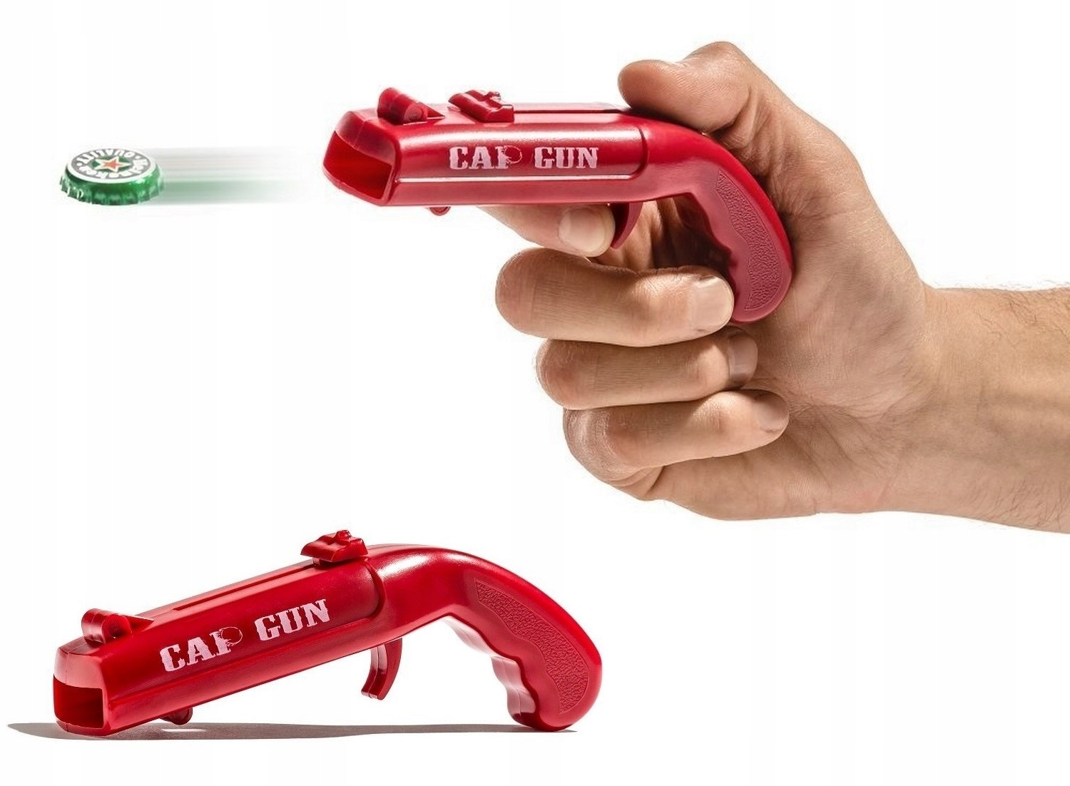 Винятково фантастична пляшка -відкриття пляшки. Він не тільки ефективно відкривається, але й стріляє шапками, і це досить далеко :). Пити пиво набуває нового виміру з цим відкривачем, ви можете не тільки насолодитися улюбленим напоєм, але й розважитися наодинці або з друзями та довести свою точність;) Все, що вам потрібно зробити, - це витягнути пружину, відкрити пляшку (ковпачок утримуватиме магнітом), і ви можете безпечно натиснути на тригер. Пам'ятайте, однак, не націлюватись на людей чи тварин.