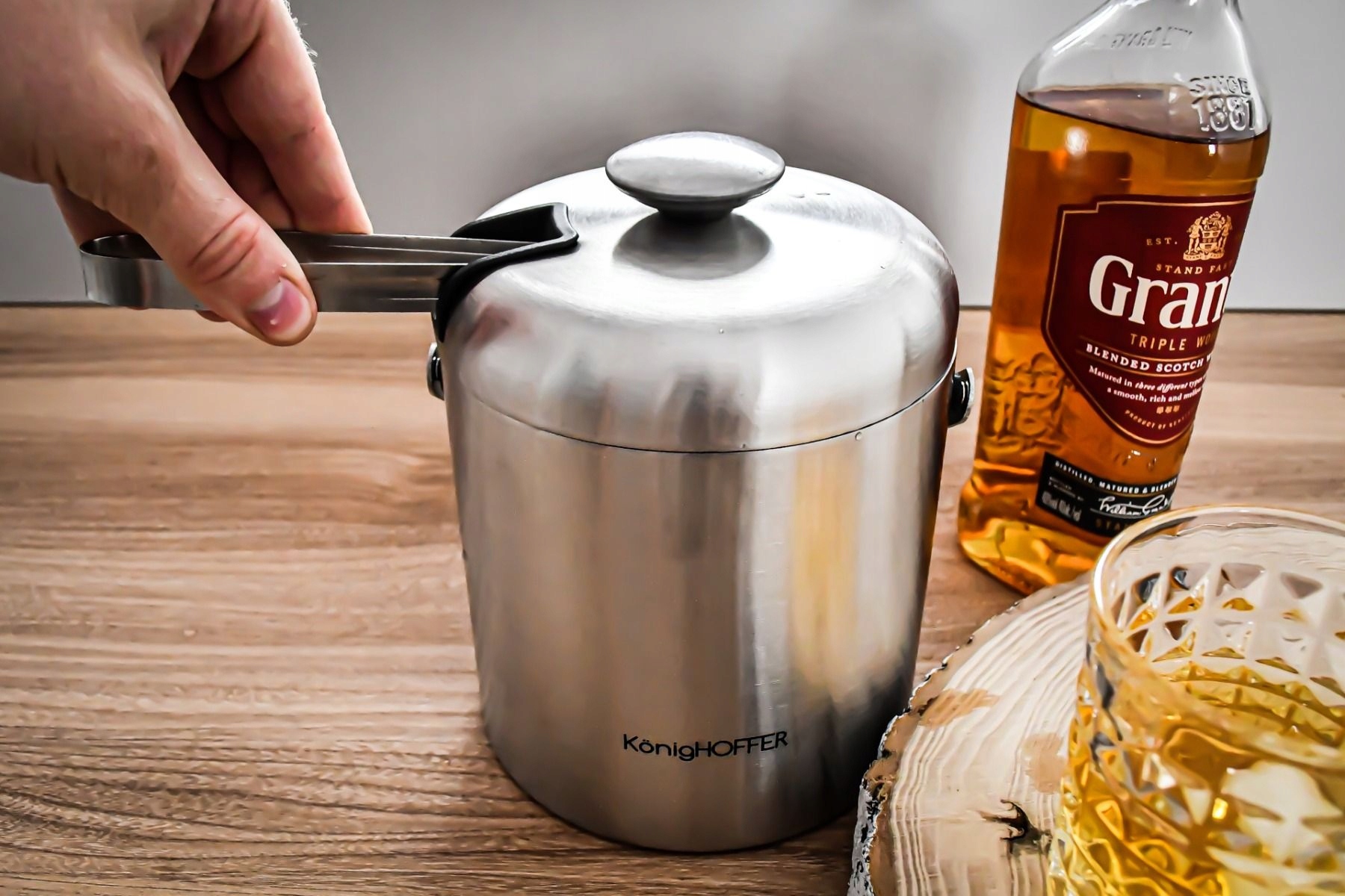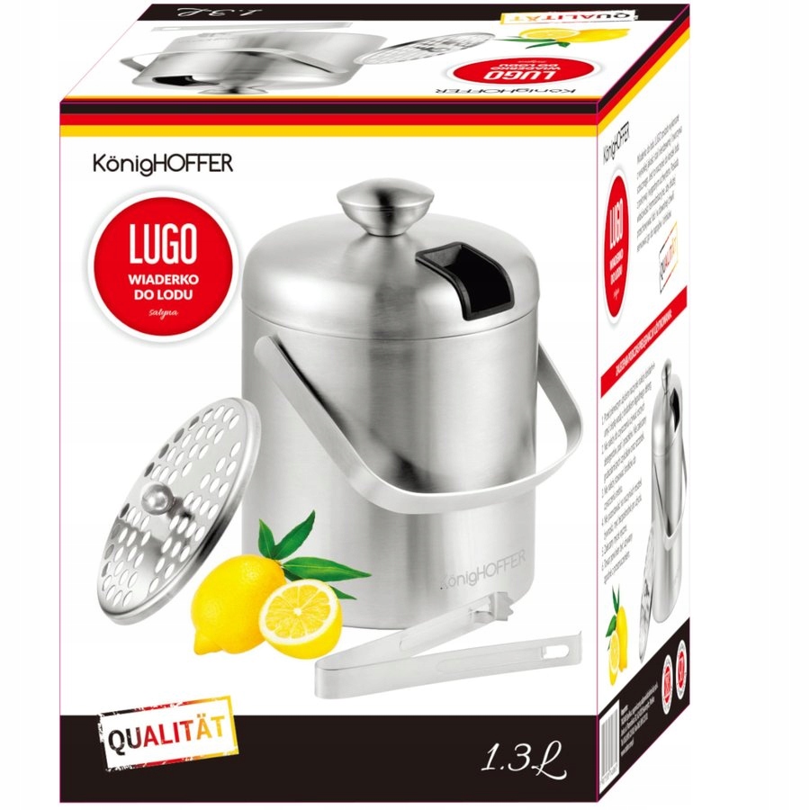 Відерце для льоду виготовлено з високоякісної нержавіючої сталі. Відерце оснащене щипцями для розміщення кубиків льоду. Кришка каструлі дозволяє заховати щипці. Кришка також оснащена зручною ручкою. Додатковий дренаж надзвичайно зручний, утримуючи лід над шаром води, що є результатом його повільного танення. Відерце теплоізоляційне за допомогою подвійних стінок, що дозволяє зберігати кубики льоду та подавати їх у будь-який час з напоями.
