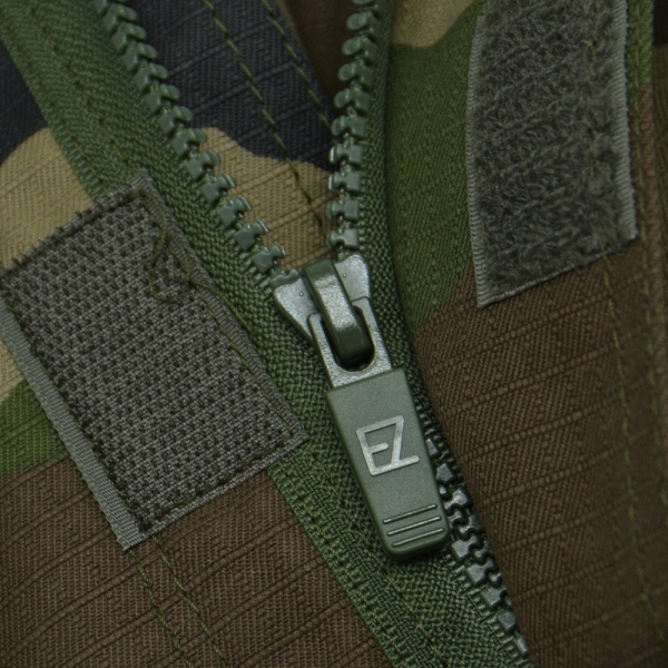 Куртка застібається на блискавку з захистом від штормового клапана. Крім того, він має підсилення на ліктях, рукава регулюються за допомогою липучок, а талія і стегна регулюються за допомогою шнурка. Нагрудні кишені дуже важливі для доступу під час носіння бронежилета. Крім того, у нас є дві кишені, що застібаються на канадські гудзики, і по одній кишені на кожному рукаві для медичних потреб. Комір можна носити розстебнутим або застібнутим трохи нижче підборіддя, що зручніше під бронежилетом.