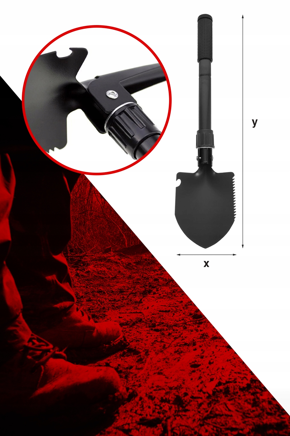 - 6 в 1: лопата , кирка, сапа, пила, відкривачка для пляшок/консервних банок, компас
