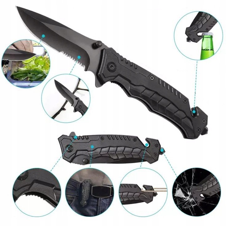 ☑️ Зручний і легкий складаний ніж із багатьма функціями з ріжучим гачком, відкривачкою для пляшок, пилкою та ломом — це інструмент що ви можете прикріпити його до пояса чи рюкзака, щоб завжди мати під рукою.