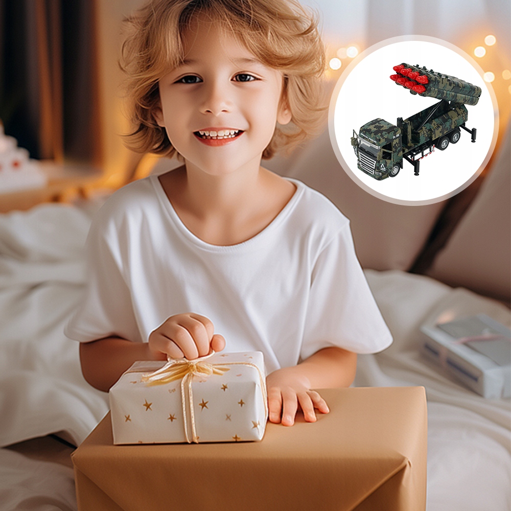 Цей військовий автомобіль іграшки оснащений 16 кулями, які можна зарядити, вивантажити та запустити. Башта може піднятися на 45 °.
