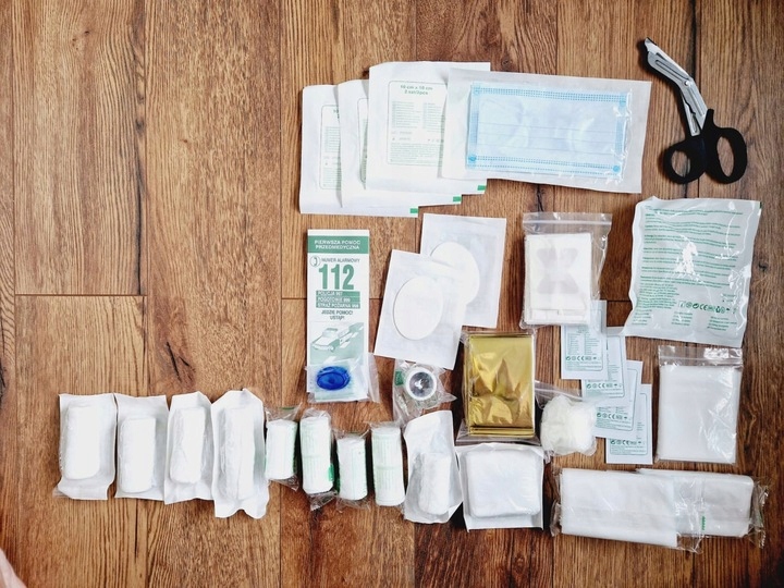 ✅ Обладнання: бандаж, гнучкий бандаж, шарф, трикутний шарф, зволожені серветки, рятувальна фольга, марля для перев'язування, інструкції з надання першої допомоги, стиснення очей, стиснення для ран, маску, ножиці, діапазон тиску, індивідуальні заправки, шматочки з заправкою, одноразові рукавички, штампування рукавичок, інсульти для заправки Штучне дихання, алкогольні бавовняні тамлики, сумки
