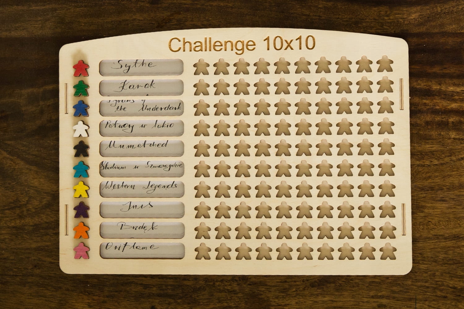 Таблиця викликів 10x10 стандартна для підрахунку ігор виготовлена з фанери. У дошці є висувна вставка, на яку ви входите (самостійно) 10 імен ігор, які ви будете грати. Вставка загортається з обох боків, тому ви можете змінити імена в списку ігор (потім ви можете прикріпити інший список і знову завершити). Після першої гри, яку ви граєте, ви поставите Meepla в перше поле в певному рядку, і після наступних частин ви переміщуєте Meepla на наступні поля праворуч. Meeple товщі, ніж отвори, в яких вони вставляються, тому їх можна легко видалити та вставити.