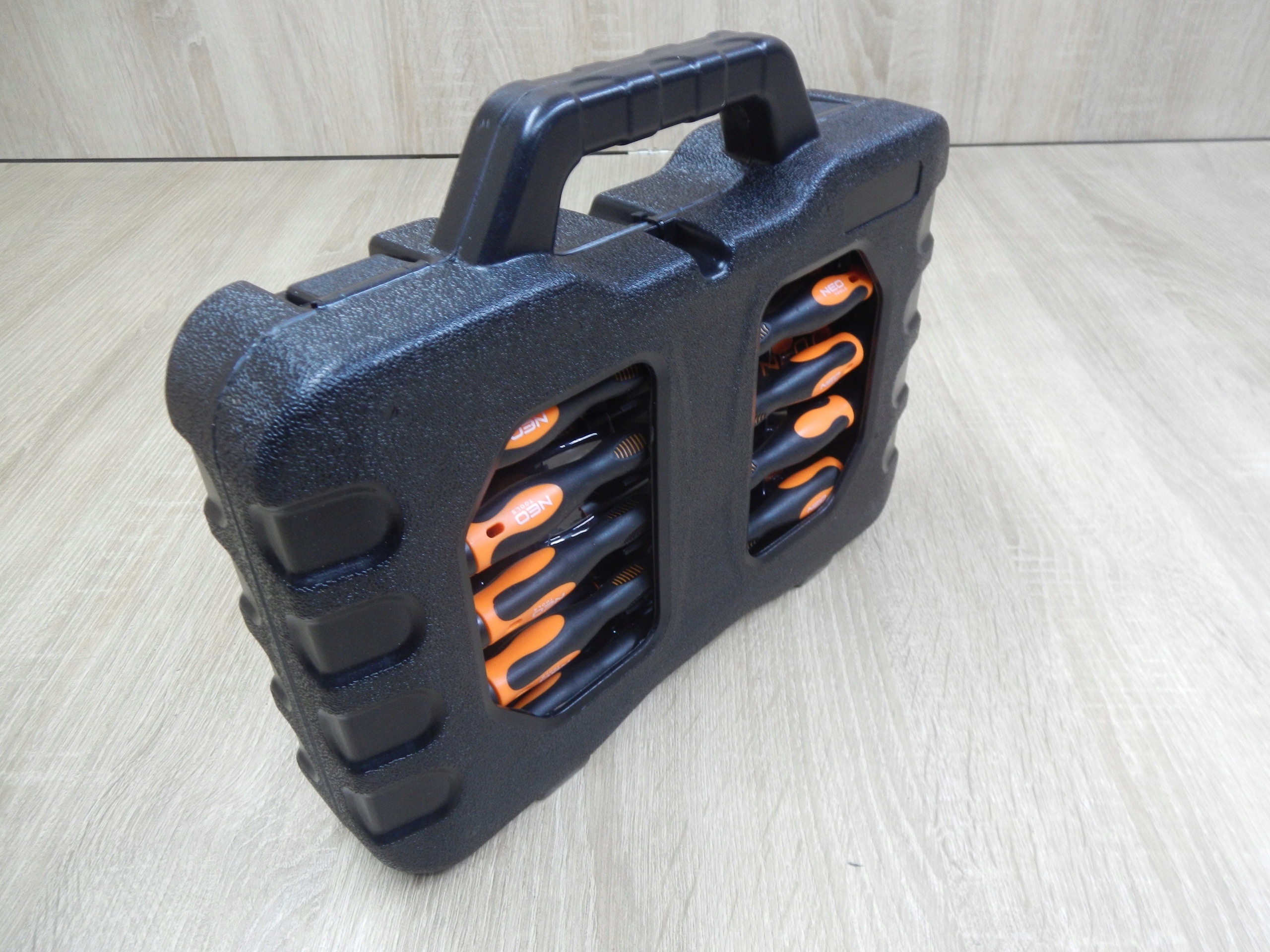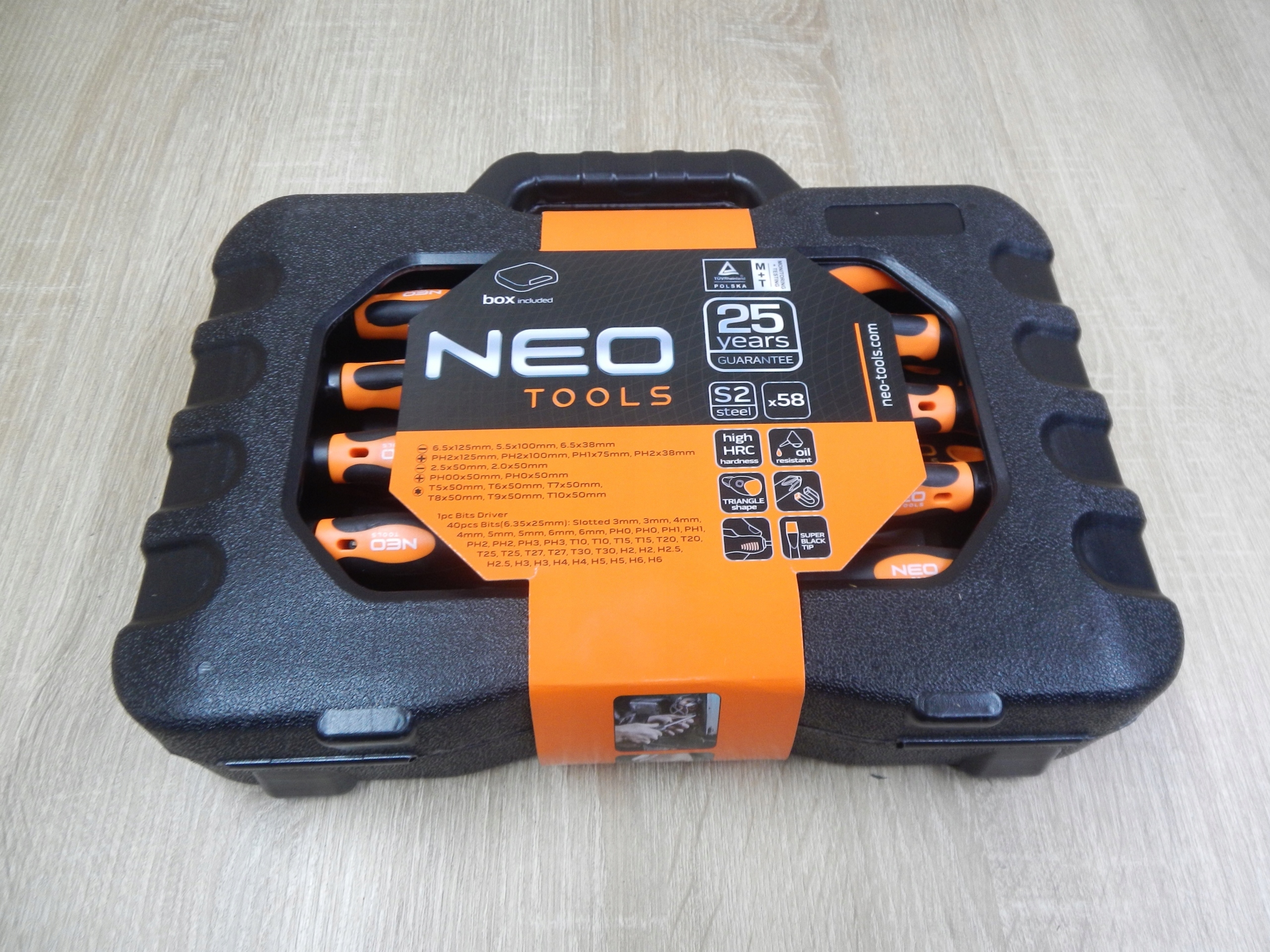 Набір викруток і насадок NEO містить 58 високоякісних елементів. Наконечник кожної викрутки виготовлений з дуже міцної сталі S2, що забезпечує тривалий термін служби. Викрутки мають магнітний наконечник. Трикутна форма ручки з профільованим упором для великого пальця знижує навантаження на руку під час роботи та сприяє отриманню оптимального крутного моменту. Двоматеріальна ручка запобігає ковзанню в руці та стійка до хімікатів, масел і жирів. Якість інструменту підтверджено 25-річною гарантією від виробника. Усе це, разом із 10 високоякісними точними викрутками та 40 бітами різних форм і розмірів, вкладено у зручну валізу для зручного транспортування та зберігання. Торгова марка NEO відповідає очікуванням професіоналів.