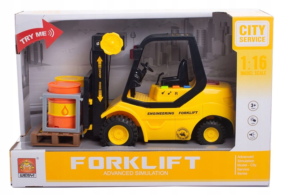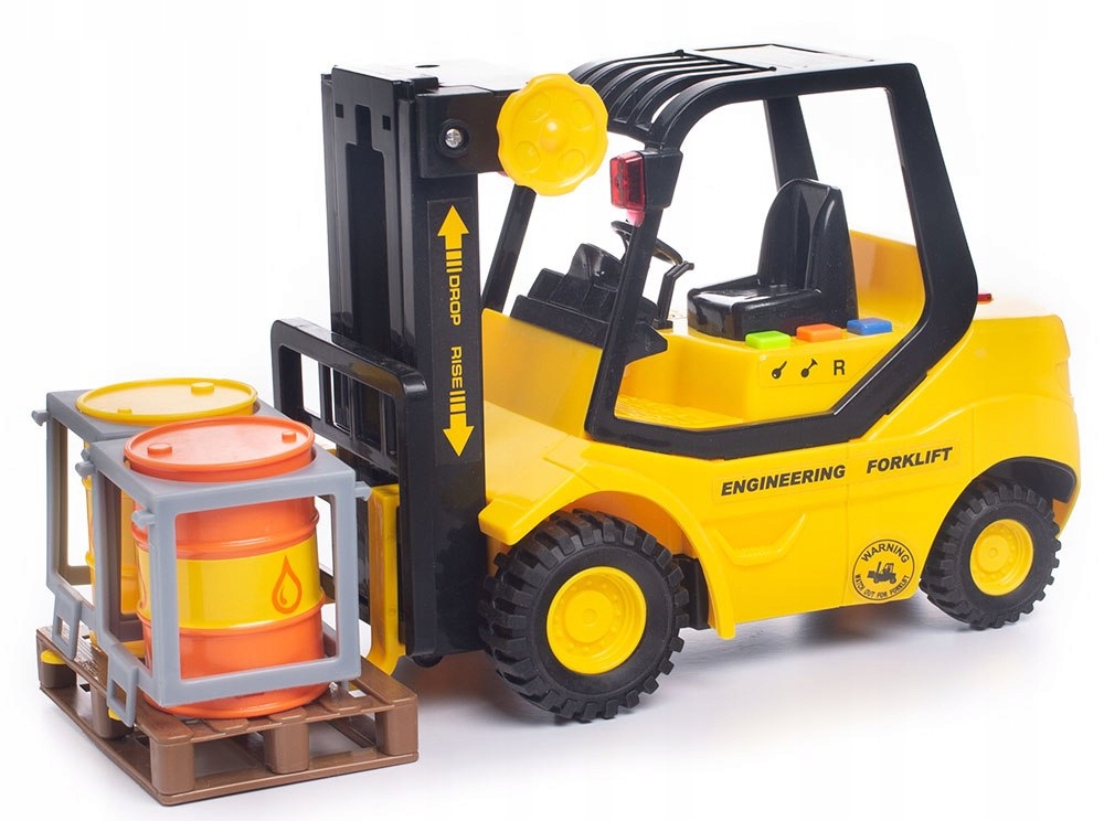 Іграшка складається з великого навантажувача з підйомником з палітрою . Акумуляторний автомобіль зі звуком та світлом. У кожному складі необхідний навантажувач з рухомими елементами. Цей повний набір повністю виготовлений з пластику, має рухомі елементи, легкі та звукові ефекти, відповідатиме кожному навантаженню.