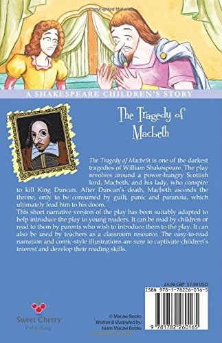 Макбет — одна з найпохмуріших трагедій Вільяма Шекспіра. Дія п’єси обертається навколо жадібного до влади шотландського лорда Макбета та його леді, які змовляються вбити короля Дункана. Після смерті Дункана Макбет сходить на трон, але його поглинають почуття провини, паніка та параноя, які зрештою приводять його до загибелі. Також доступний як частина набору з 20 книг, зокрема «Ромео і Джульєтта», «Гамлет», «Трагедія Макбета», «Сон в літню ніч», «Зимова казка», «Приборкання норовливої», «Буря», «Дванадцята ніч», «Тімон Афінський», «Два джентльмени з Верони», «Венеціанський купець», «Отелло», «Багато шуму з нічого», «Король Лір», «Юлій Цезар», Цимбелін, Комедія помилок, Як вам це подобається, Антоній і Клеопатра та Все добре, що добре закінчується. Про Sweet Cherry Easy Classics: Sweet Cherry Easy Classics адаптує класичну літературу в історії для дітей, представляючи ці позачасові казки новому поколінню.