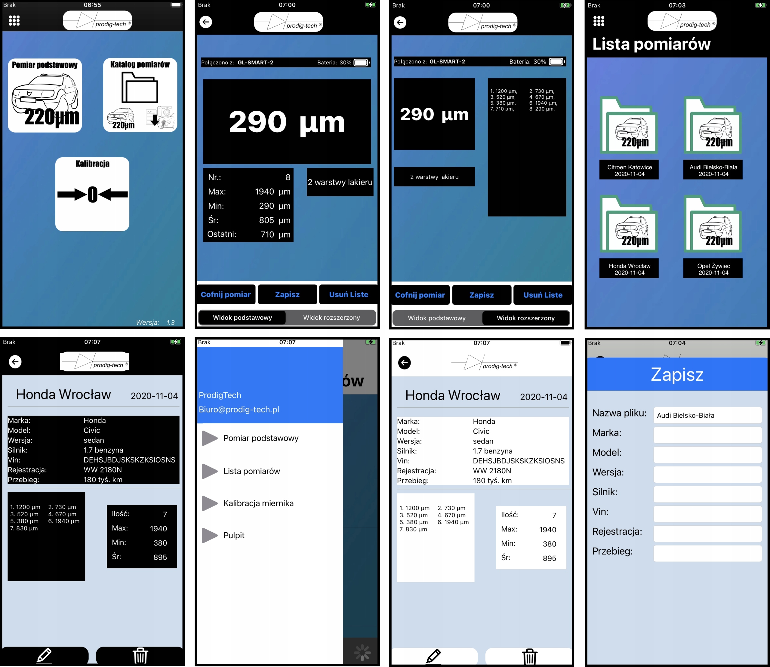 Містить збережені вимірювання, розділені на професійні (іконки з синьою рамкою) і базові (іконки із зеленою рамкою) . Вибравши певний файл вимірювань, ми маємо можливість редагувати такі дані, як марка, двигун, модель, пробіг, дані особи, яка проводила вимірювання, висновки тощо. Крім того, файл із професійними вимірюваннями має функція експорту даних у файл PDF у формі звіту.
