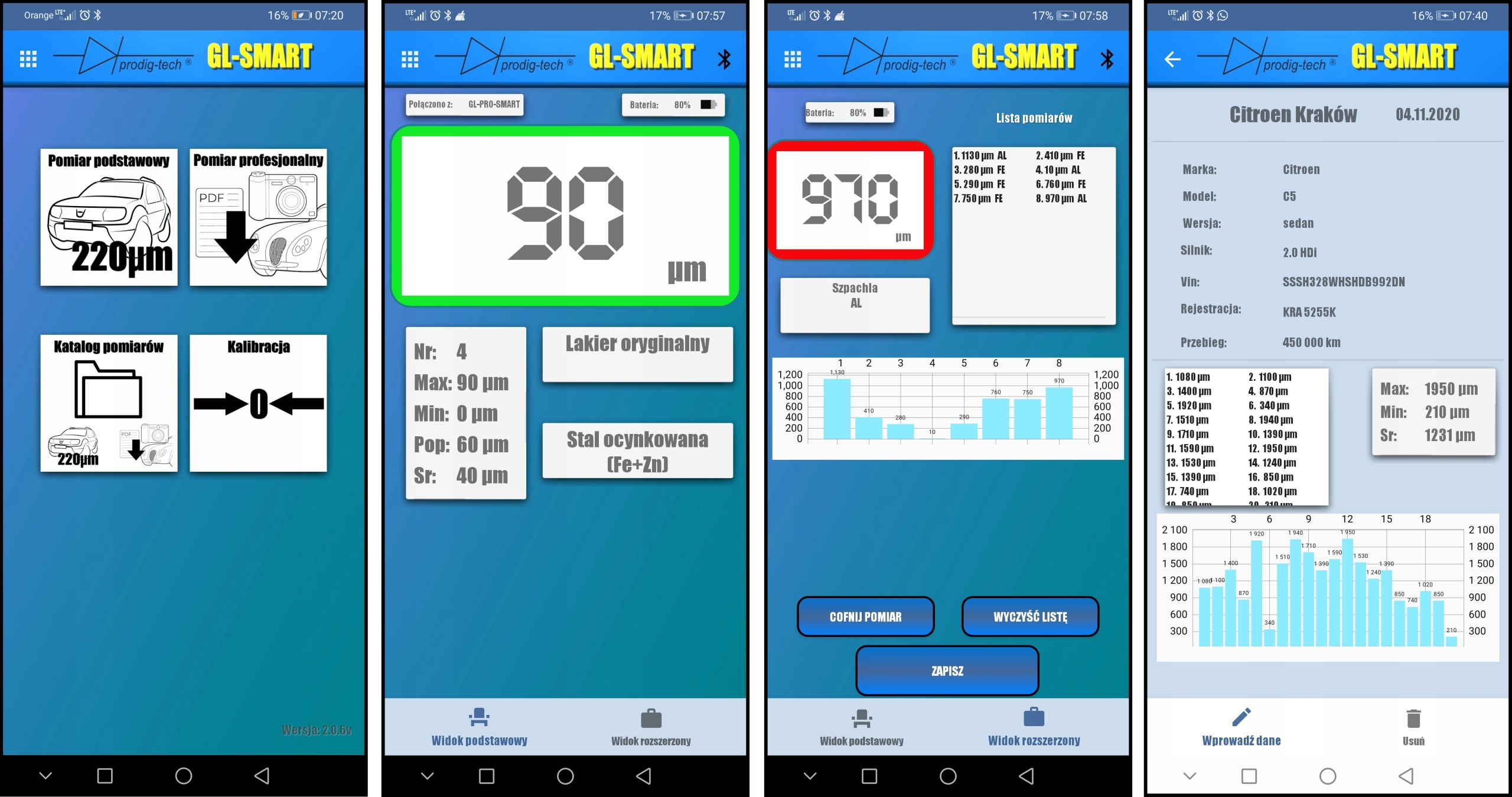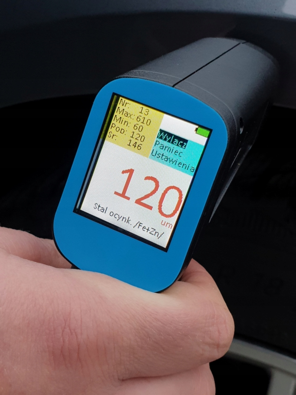 Товщиноміри фарби GL-PRO-SMART-FAZ мають функцію, яка полегшує виявлення цинкового шару на сталевих листах. Це корисна функція, особливо при пошуку вживаного автомобіля. Досить часто в автомобілях після ДТП замінюють весь кузовний елемент, наприклад, крило. Якщо такий елемент новий і пофарбований згідно з художнім оформленням, важко перевірити, чи він оригінальний чи замінний, лише вимірявши товщину фарби - показання можуть свідчити про те, що елемент оригінальний із заводу. Аналогічні корпусні елементи, що випускаються різними компаніями, часто не покриті шаром цинку. Звичайно, щоб розрізнити такий елемент, решта автомобіля повинна бути виготовлена з оцинкованої сталі, що буде виявлено лічильником (показ FeZn). Наприклад, якщо ми отримуємо індикацію цинку на одному крилі, а на іншому немає, це може означати, що елемент було замінено.