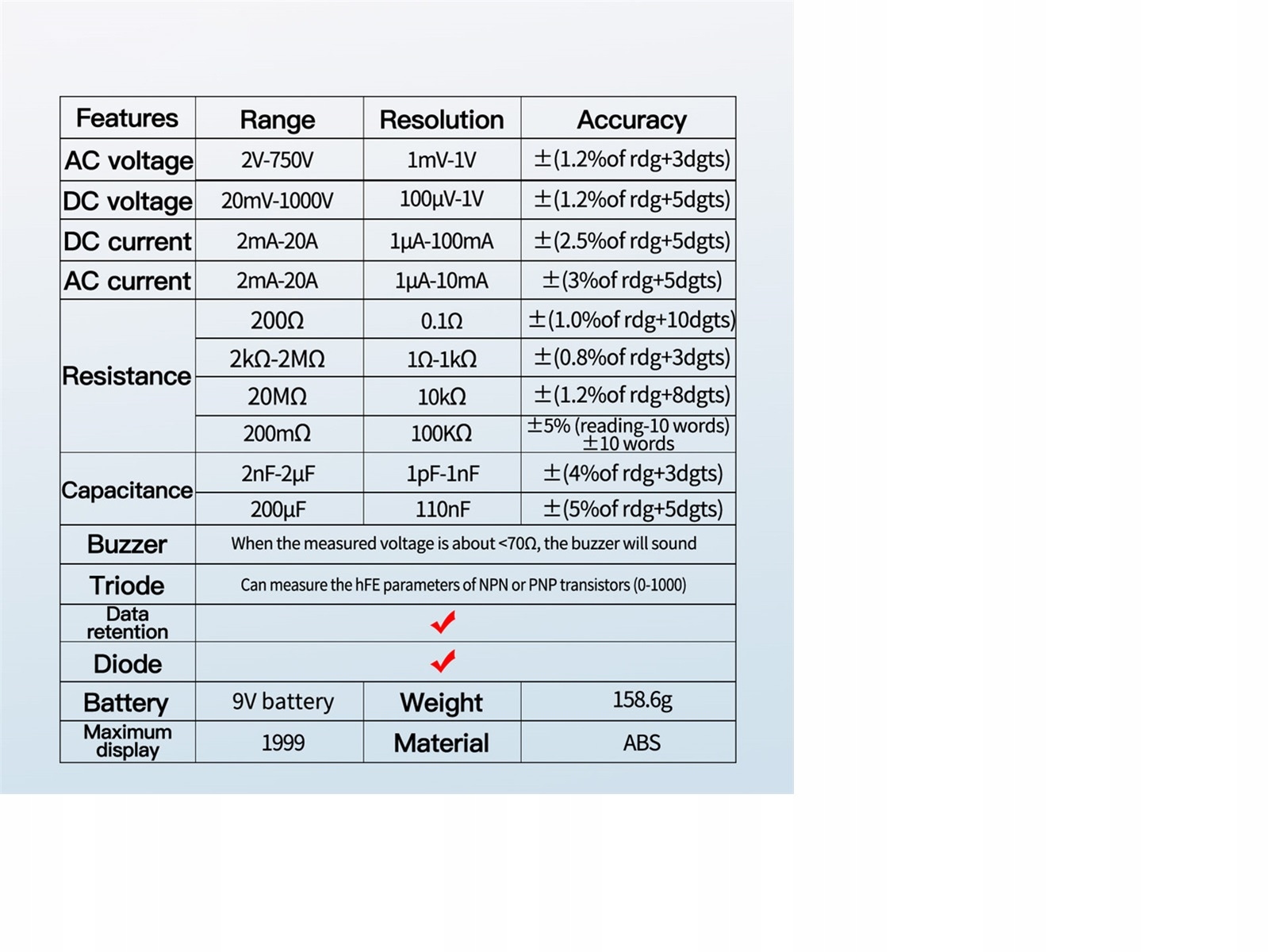 - Максимальний дисплей: РК-дисплей 3 ½ цифри (1999 відліків) 0,6 дюйма заввишки