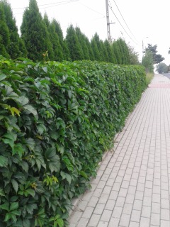 Лоза досягає 20-30 м (0,5-1 м в рік). Плющ — це швидкозростаюча, дерев’яниста ліана, яка сама чіпляється. Походить з Північної Америки. Має розгалужені вусики і придаткове коріння. Листя зазвичай складається з п'яти еліптичних частин, зелених зверху і сіро-зелених знизу, восени стають багряно-червоними і опадають після перших заморозків. Виноградна лоза є найкращою лозою для покриття стін будівель, і вона добре росте в міських і промислових районах. За рік вони виростають на 1-2 м. Декоративна листя, осіннє червоне забарвлення листя надзвичайно вражає. Квітки непоказні, плоди майже чорні, ягоди неїстівні. Вимоги. Середньоґрунтовий, сонячні або напівзатінені місця, також добре переносить північну експозицію. Рослини на сонячних місцях краще забарвлюються.