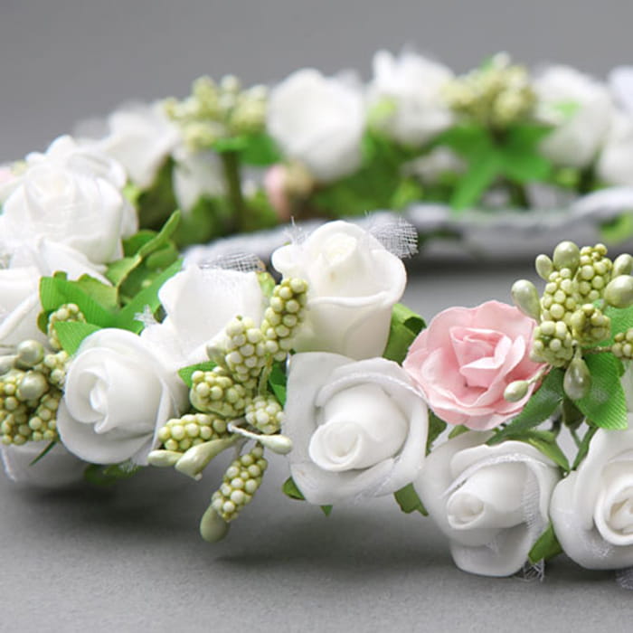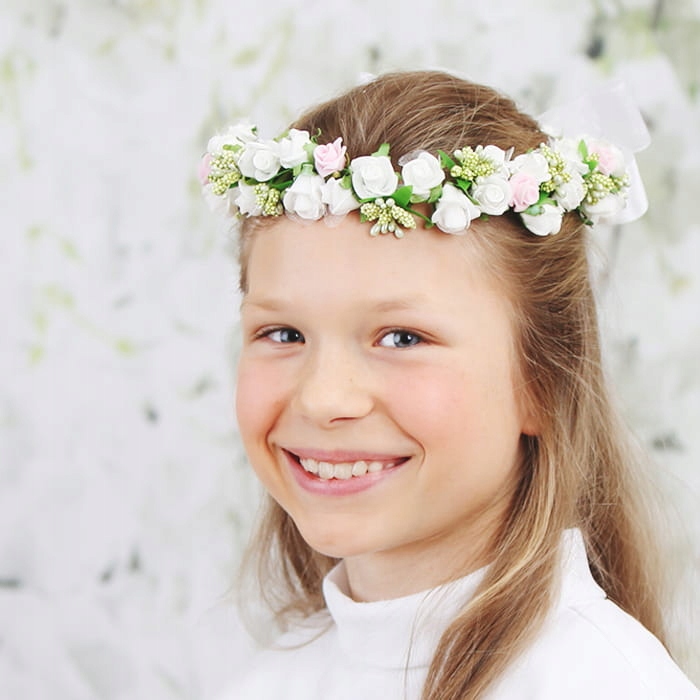 - Прикрашений вінок для причастя різнокольоровими квітами троянд, красивою зеленою штукатуркою та листям.