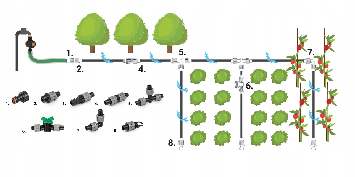 - ліктя для стрічки (6 штук) - дозволяє регулювати потік води в різних частинах системи