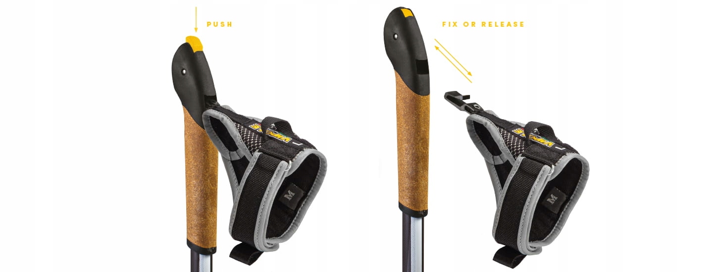 Інноваційний ремінь, розроблений для палиць для скандинавської ходьби. Він має світловідбиваючу окантовку для гарної видимості в темряві та систему швидкого з’єднання Top-Click, щоб швидко розстібнути ремінець одним пальцем.