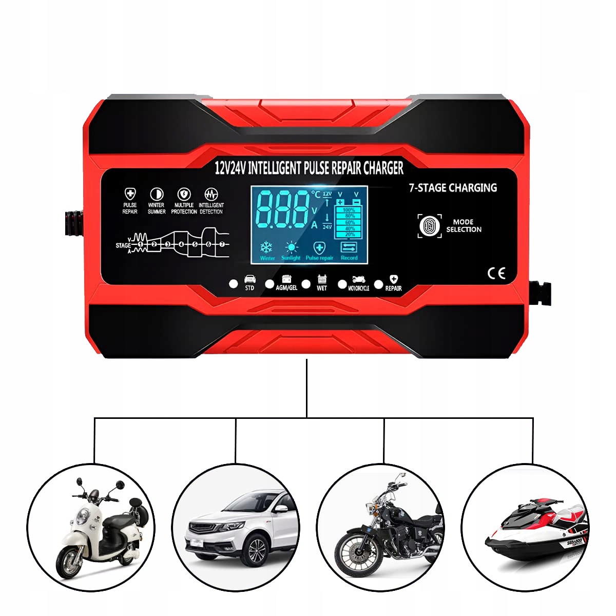 Зарядний пристрій підходить для свинцево-кислотних акумуляторів 12V 2Ah-150Ah і свинцево-кислотних акумуляторів 24V 2Ah-100Ah, включаючи AGM, GEL, SLA, VRLA, які можна використовувати в різних транспортні засоби та човни, наприклад автомобілі, мотоцикли, вантажівки тощо.