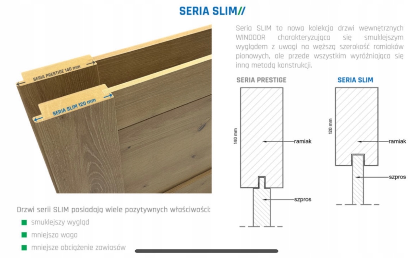 Корпус рами складається плит МДФ товщиною 22 мм. Лицьова частина (з боку дверей) і регулювальна частина виготовлені з плоских кутових стрічок. Вищезазначені елементи покриті відповідним типом шпону. Виріб дозволяє змінювати ширину в діапазоні від 20 мм, а різні діапазони дозволяють встановлювати його в стіну товщиною від 80 мм до 360 мм. Кожна панельна дверна рама має опцію третьої петлі.