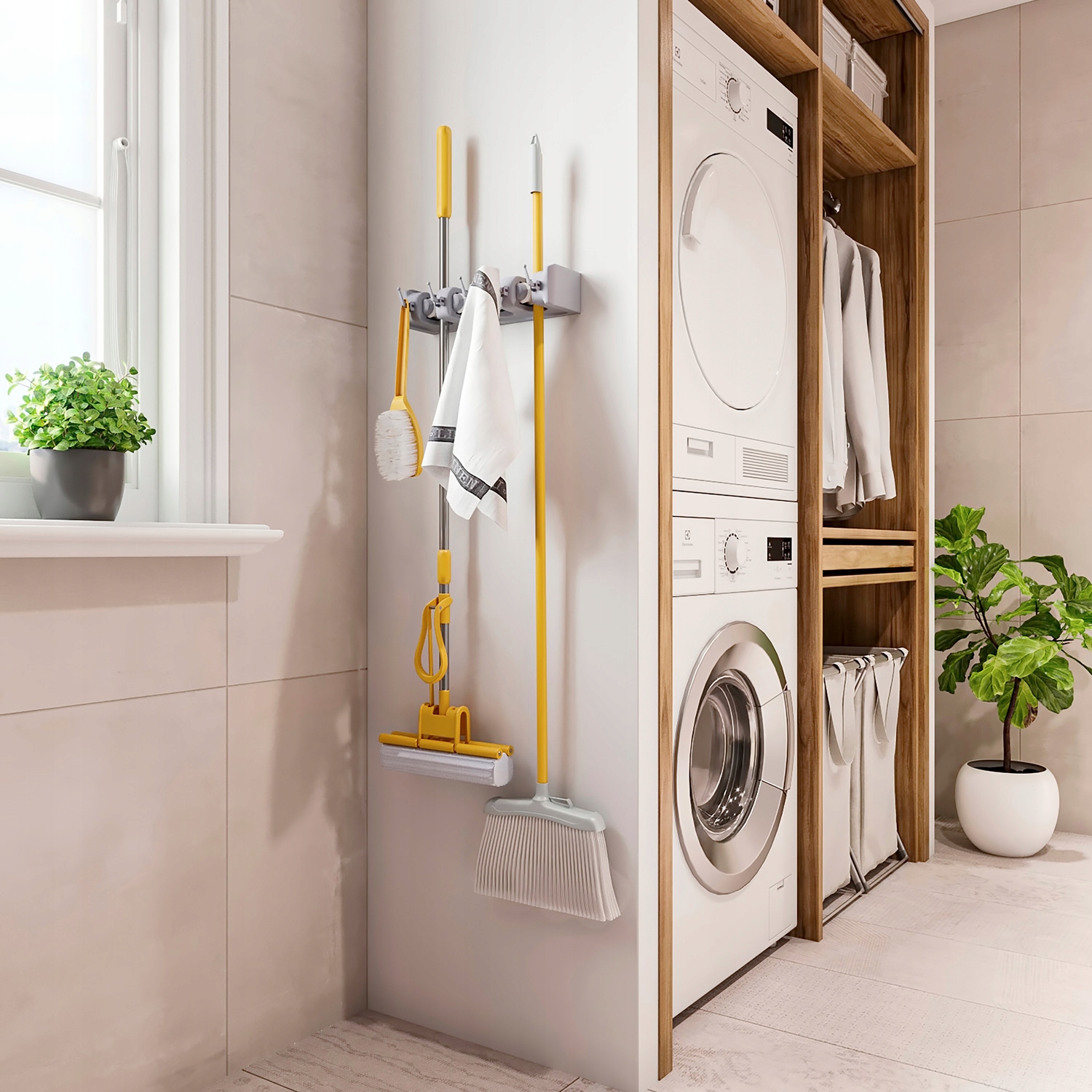 У тримача є 5 вішалок на які можна повісити ганчірки, ганчірки, совок, дрібні інструменти, які мають отвір для підвішування або на мотузці тощо. Вішалки є складними, тому їх можна розкласти лише за потреби.