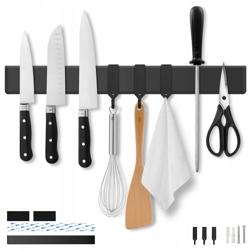 ВІШАЛКА ДЛЯ НОЖІВ 40 СМ НЕРЖАВІЮЧА СТАЛ З СИЛЬНИМ МАГНІТОМ І 3 ГАЧКАМИ