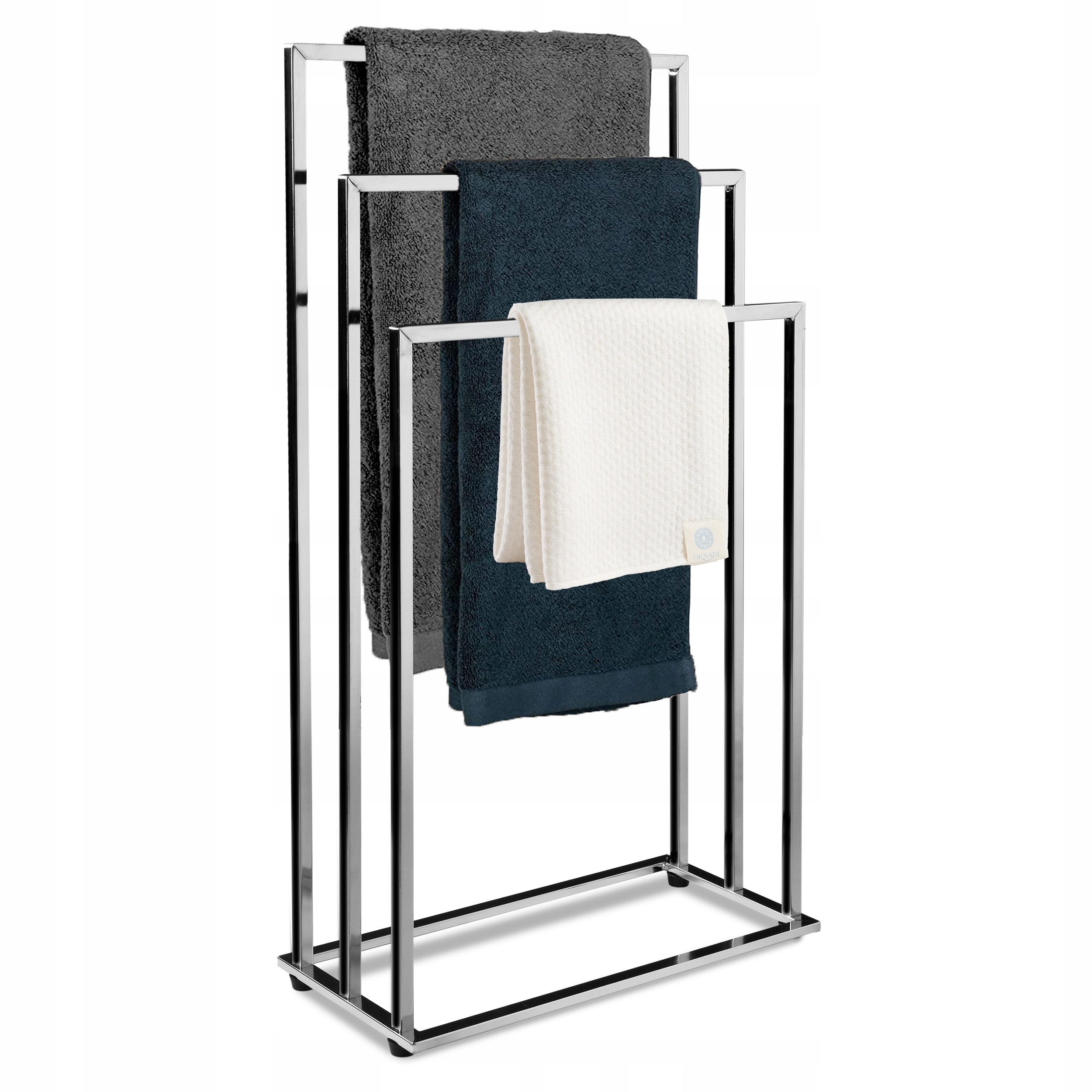 Tire - це окремо стоїть практична вішалка для рушників. Виготовлений з найякіснішої хромованої сталі. Має цілих 3 ручки на різній висоті, що полегшує одягання та знімання рушників. U-подібна конструкція рами забезпечує більш швидке та ретельне сушіння рушників та економить місце. Підставка стійка і в той же час легка. Ми легко переставляємо її в обране місце. Основа підставки закріплена захисними ніжками, які запобігають появі подряпин на підлозі. Шина ідеально доповнить будь-яку ванну кімнату. Крім практичних цінностей, це цікава прикраса кімнати, яку неможливо залишити без уваги. Підставка для рушників - ідеальне рішення для людей, які цінують функціональність і естетику у своїй ванній кімнаті. Завдяки цьому ви можете легко підтримувати порядок у своїй ванній кімнаті, додаючи до неї елегантний акцент.