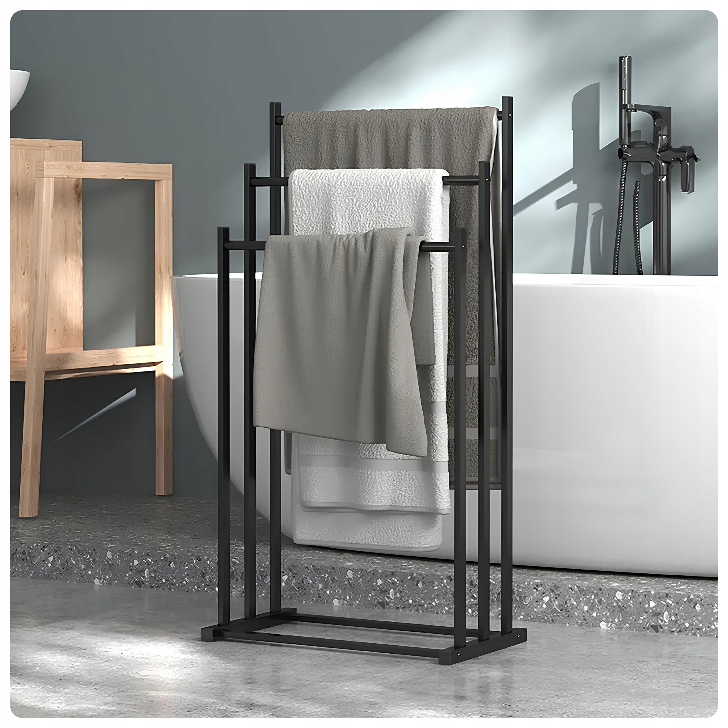 Ця окремо стояча вішалка для рушників вражає своїм мінімалістичним дизайном, стійкою конструкцією та трьома зручними ручками, які дозволяють впорядковано сушити рушники та одяг. Не потрібно збирати, тому ви можете розмістити його де завгодно – без свердління, безладу та обмежень.