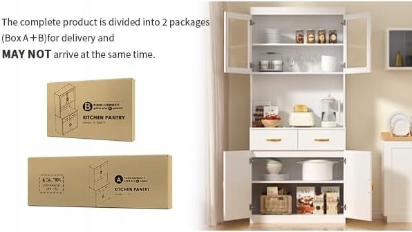 - 【Інформація про продукт】: Розміри: 80 x 40 x 180 см. Матеріал: МДФ і скло. ПРИМІТКА: Повна висока кухонна шафа в 2 упаковках (пакет A і B), може не надійти одночасно, будь ласка, зберіть після отримання обох упаковок.