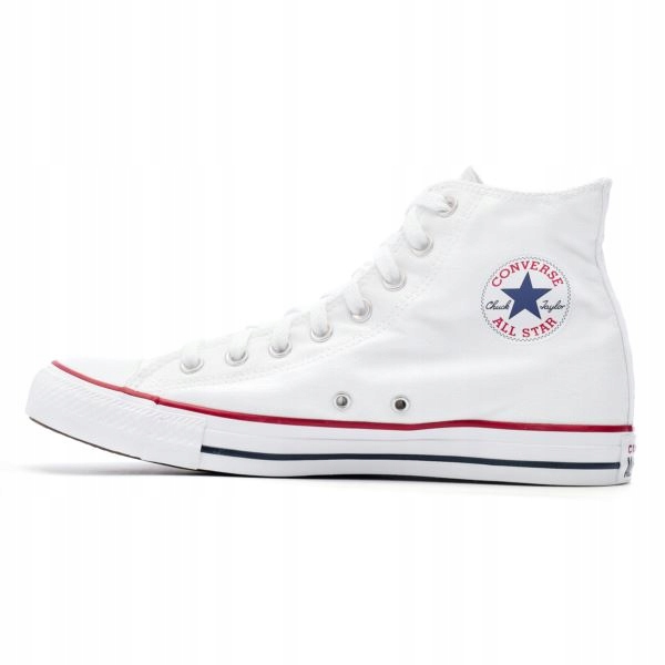 CONVERSE CHUCK TAYLOR ALL STAR білого кольору. Високий верх виконаний з текстильних матеріалів. Гумова підошва забезпечує комфорт і зменшує удари. Витончені червоні та сині смуги та класична зірка надають усьому характеру.