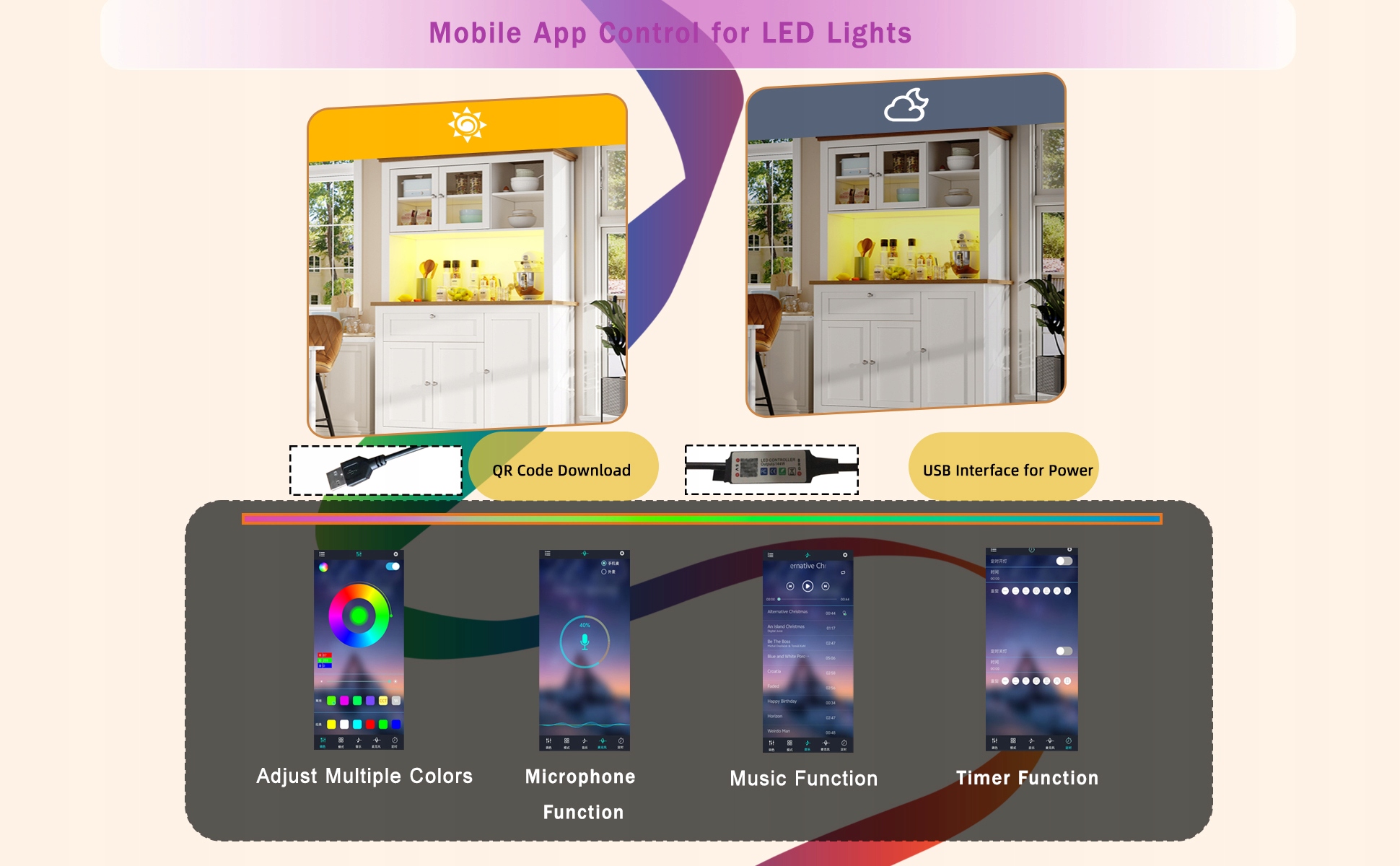 - Вишуканий дизайн та високоякісні матеріали: виготовлені з MDF високої щільності, з елегантними скляними дверима та алюмінієвими ручками, зробленими з точністю та увагою до деталей, ідеально відповідним сучасним інтер'єрам. Кольори, сканувати та завантажити конкретну програму, можливість читати локальні музичні файли залежно від сили складів та ритму, управління освітленням залежно від сили та ритму складів та відтворення ритму музики.