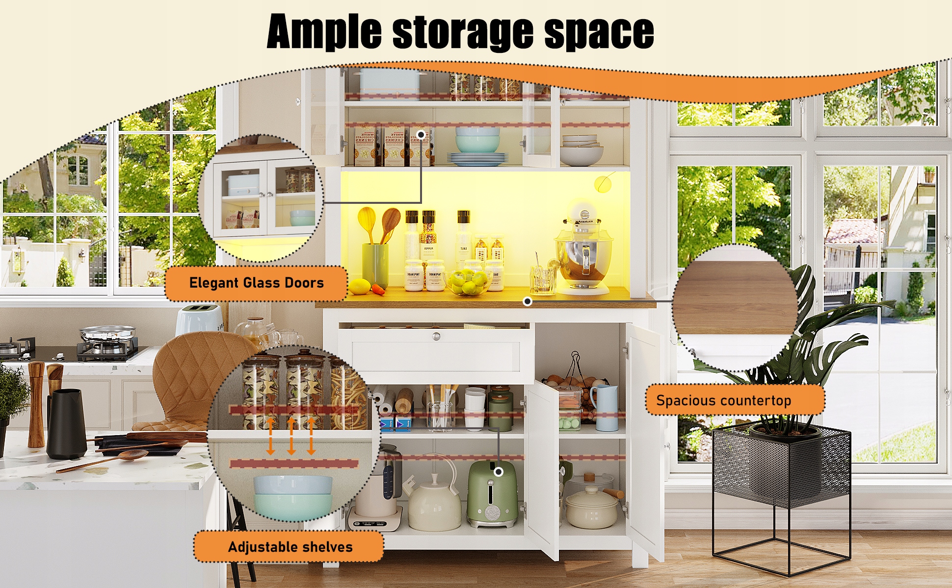Кухонний шафа (104 × 40 × 180 см), високий кухонний шведський стіл, ділянку, шведський стіл з регульованими полицями, сервант із світлодіодним освітленням, змінні світлі кольори, білі