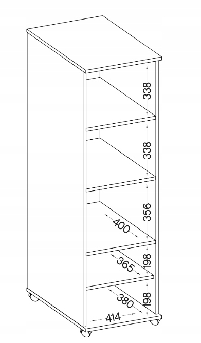 Офісний контейнер Мальта має п'ять практичних полиць, дві з яких закриті. Дві закриті полиці мають розміри 414x198x380 мм і 414x198x365 мм, перша відкривна полиця має розміри 414x356x400 мм, а дві найвищі мають розміри 414x338x400 мм (ширина х висота х глибина)