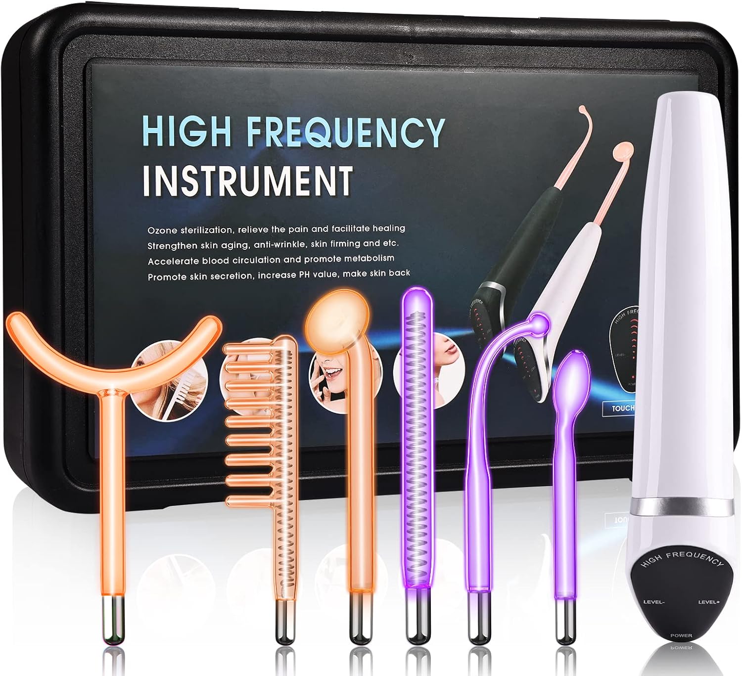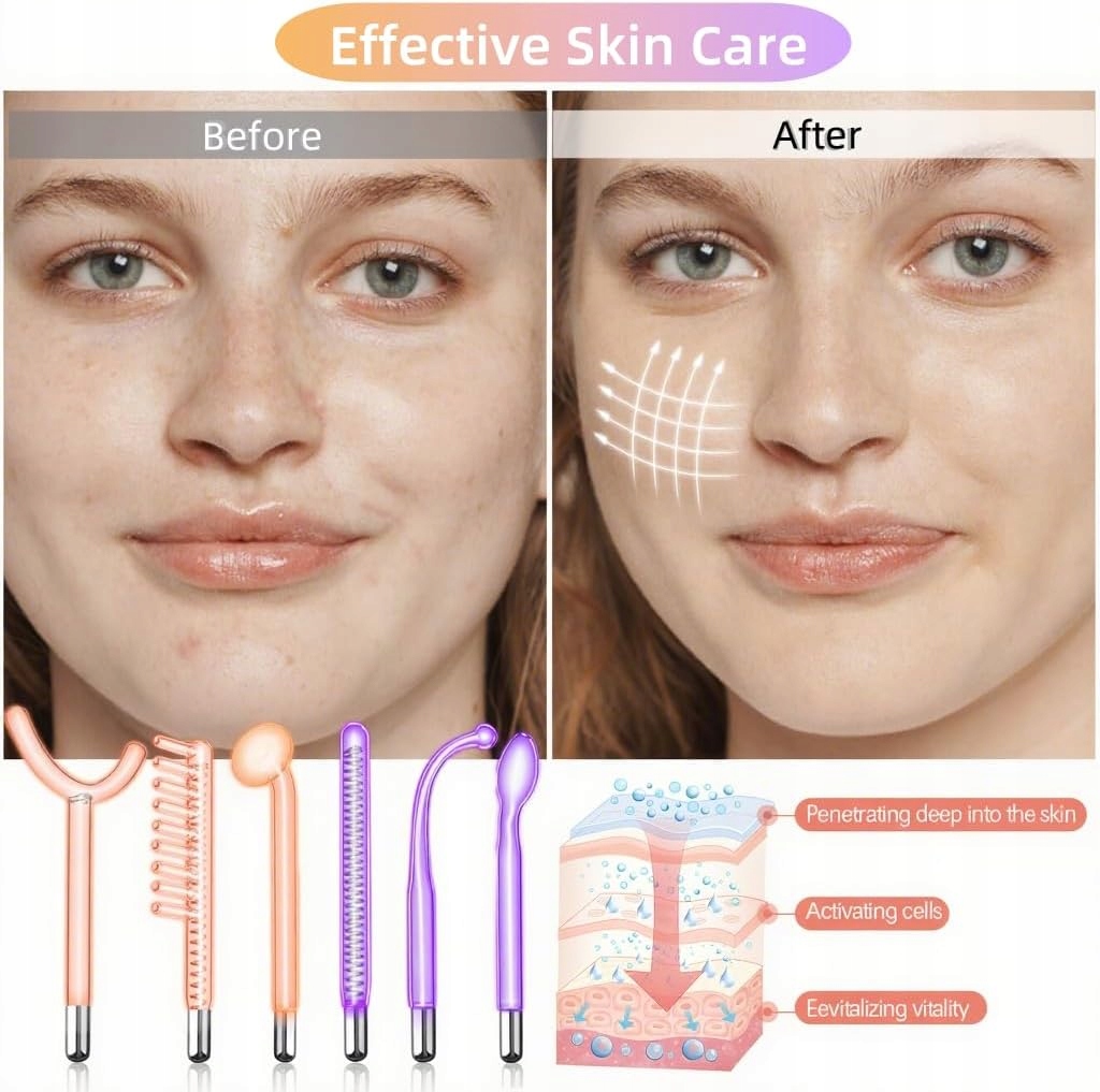 Високочастотний апарат для догляду за обличчям Esthetic — це практичний апарат для догляду за обличчям, який використовує високочастотні хвилі та 6 скляних електродів (неонові та аргонові палички). аргондля підтримки покращення зовнішнього вигляду шкіри. Регулярне використання може допомогти візуально розгладити шкіру, покращити її напругу та загальний стан.