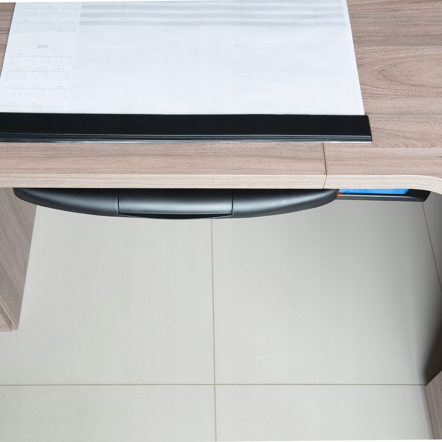 Висувна полиця для клавіатури та миші надзвичайно полегшує роботу за комп’ютером, а також є чудовим рішенням для геймерів. Форма полиці адаптована до висоти клавіатури, тому ми можемо зручно розташувати зап’ястки. Ще одним гарним рішенням є вбудований пенал, який можна використовувати для зберігання ручок, олівців тощо. Вся система працює на кулькових напрямних довжиною 350 мм, а також має регульовану висоту кріплення полиці до стільниці. Виріб виготовлено з міцного пластику, дуже стійкого до механічних пошкоджень.