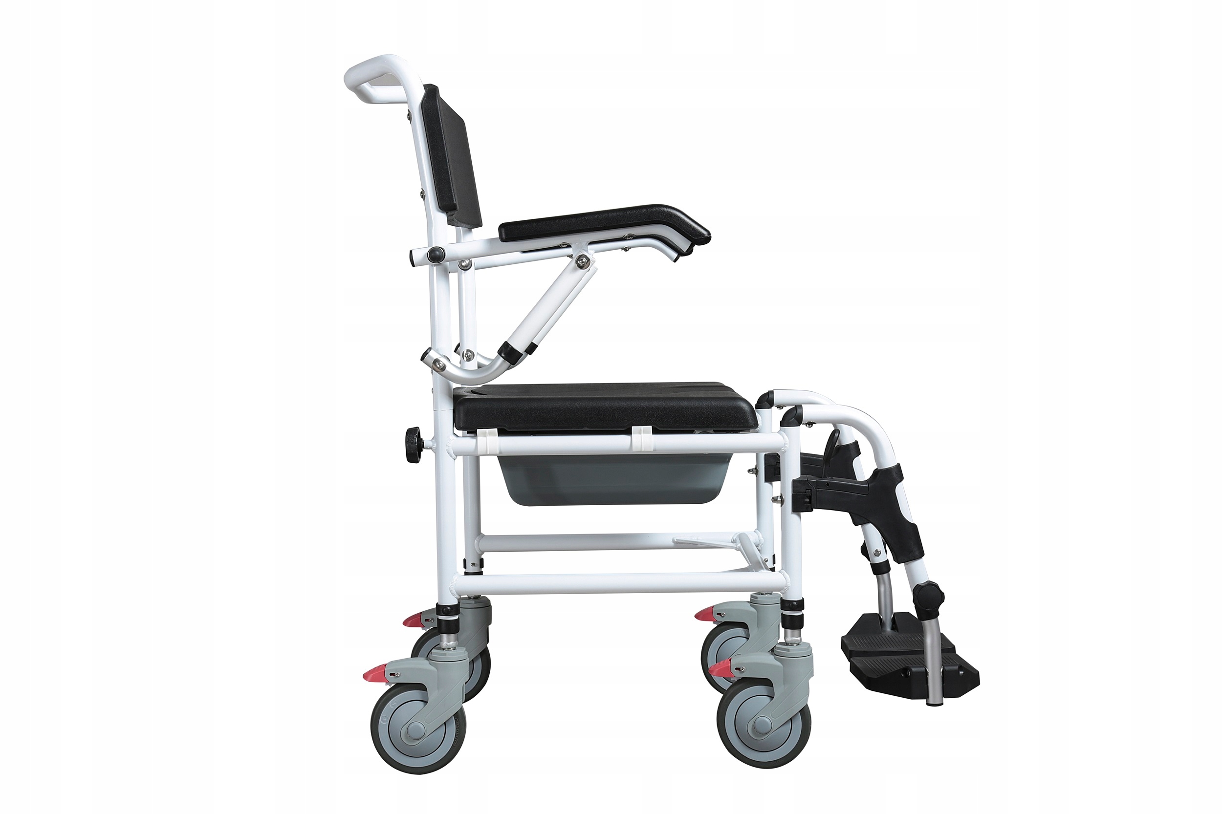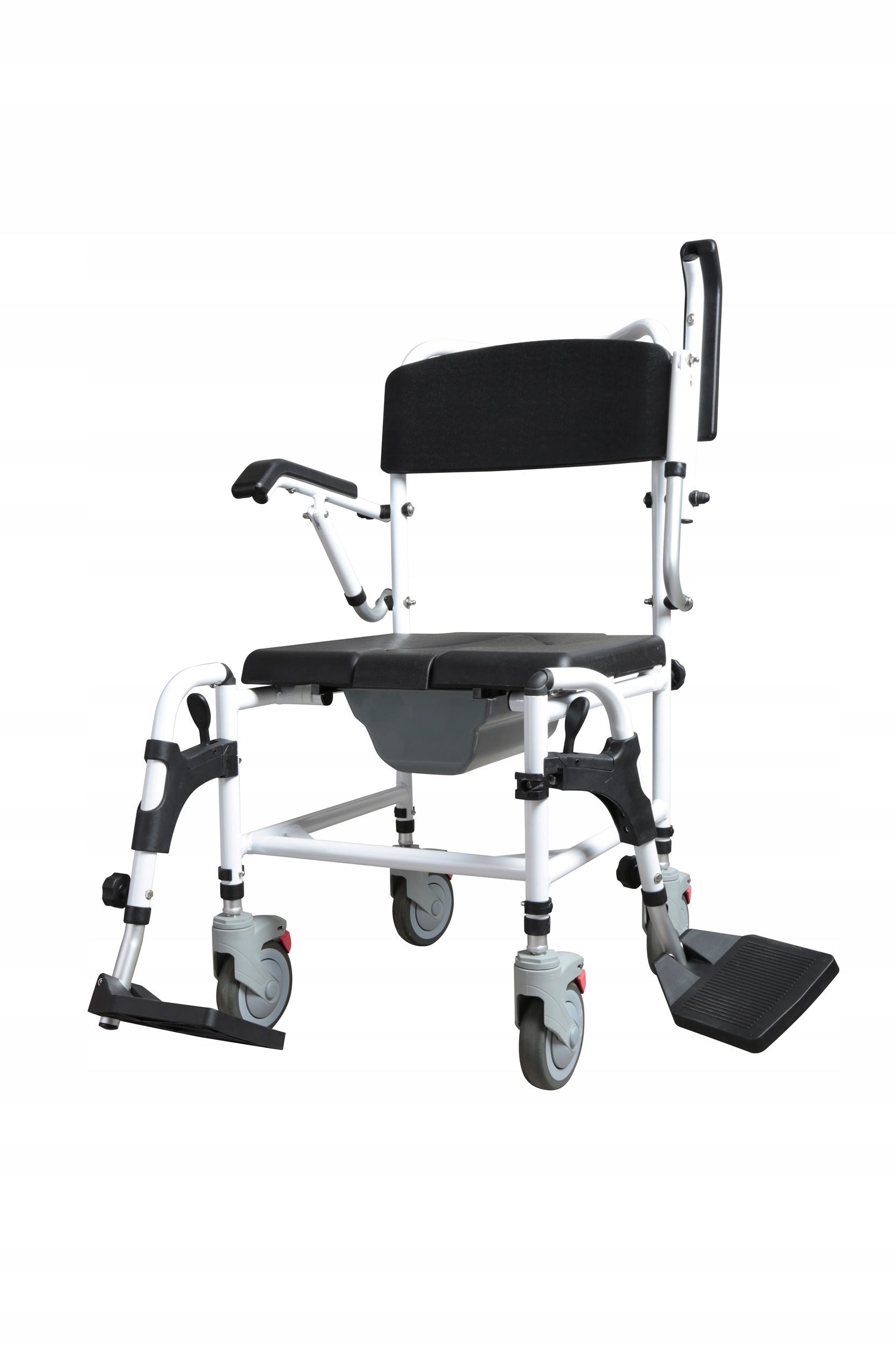 Візок для транспортування душу та туалету MASTER-TIM від торгової марки Timago є допоміжним обладнанням, призначеним для людей з обмеженими можливостями та людей похилого віку. Виготовляється з алюмінієвої рами з порошковим покриттям. Має відкидні підлокітники, що полегшує вхід і вихід пацієнтів. Додатково крісло має сидіння з клином, чотири поворотних колеса з гальмами, підніжки, що перекидаються, і санітарний контейнер. Конструкція коляски дозволяє перекочувати її через унітаз.