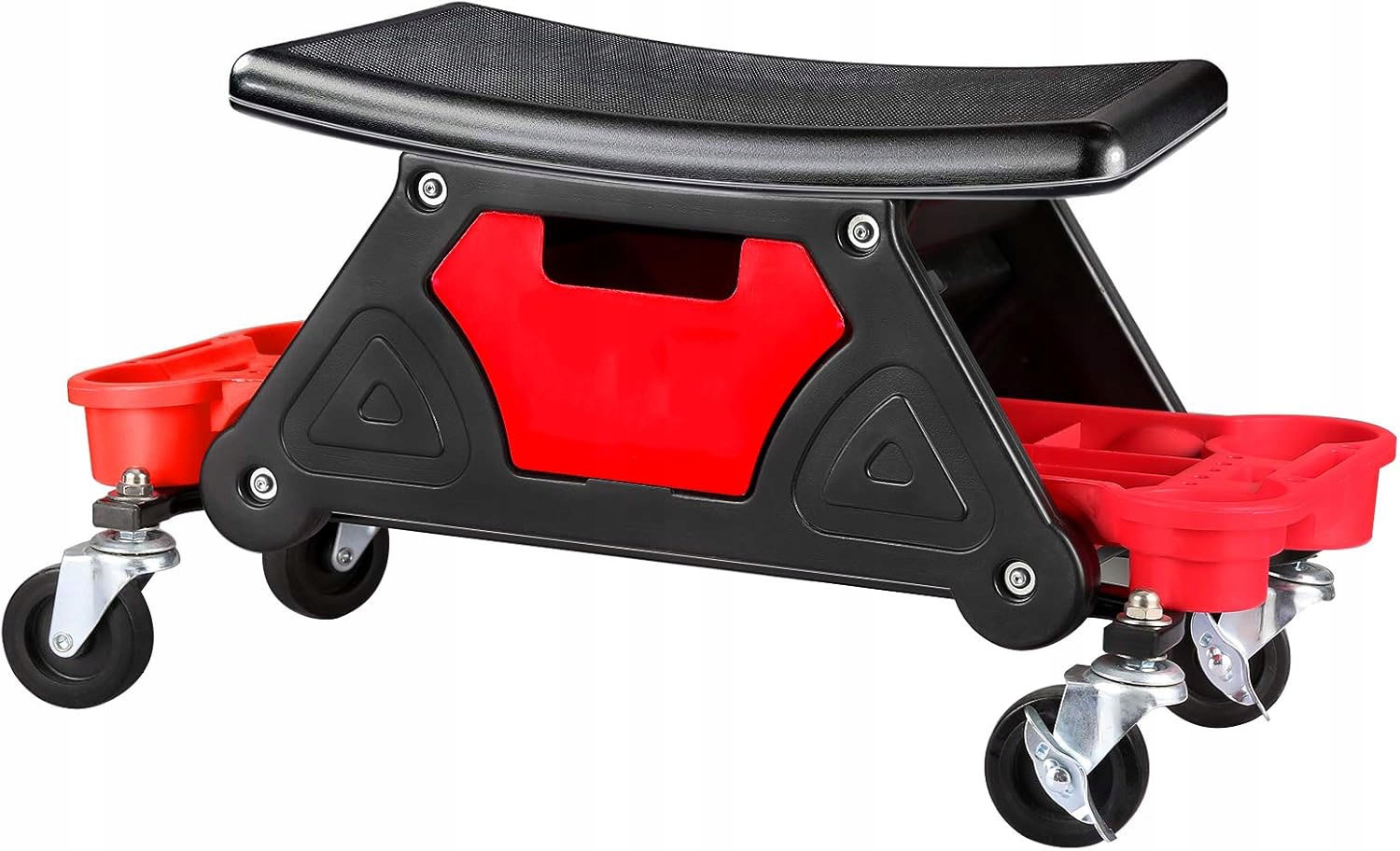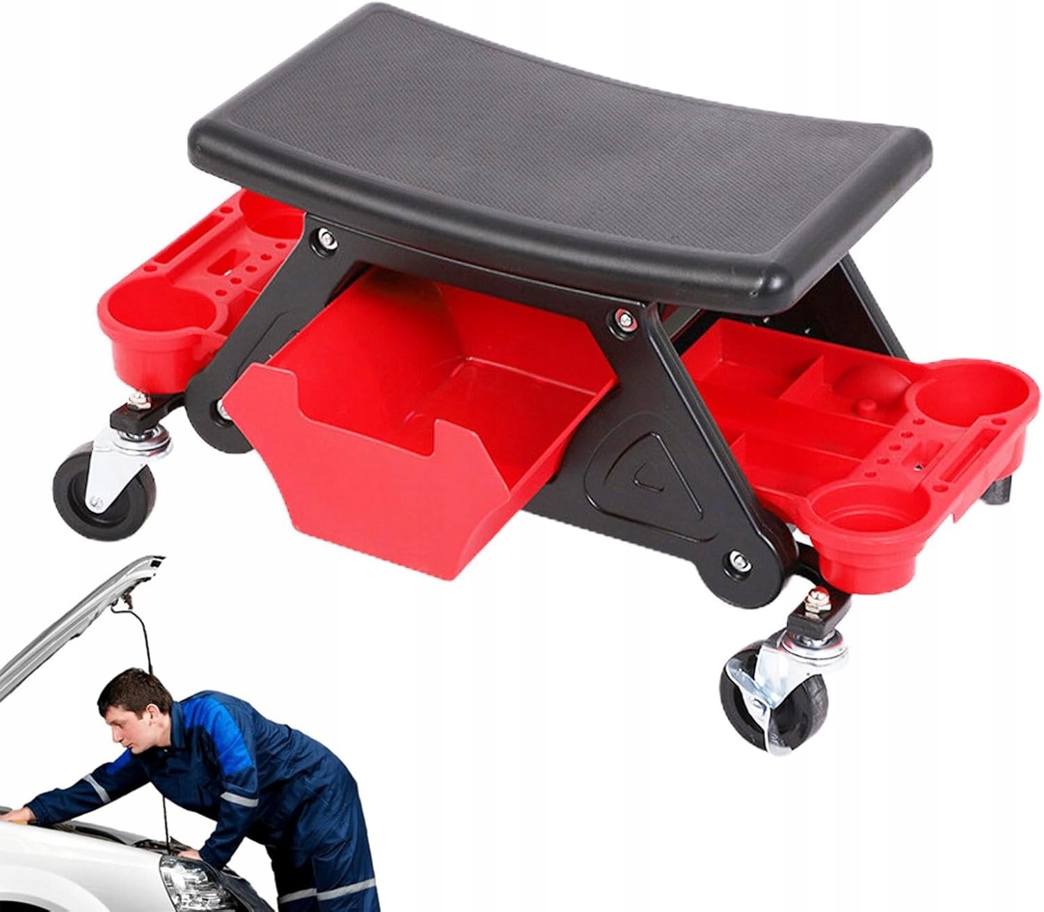 табурет також має практичні рішення для зберігання інструментів, невеликих деталей та до 4 банок з рідиною (миючим засобом або напоями). Ящик під сидінням та двома поличками дуже практичні і їх можна зняти для полегшення роботи. Корпус стільця виготовлений з надзвичайно легкого та стабільного матеріалу HDPE, що сприяє його транспорту. Велике сидіння має поверхню, що не має слизу, що дозволяє комфортно працювати.