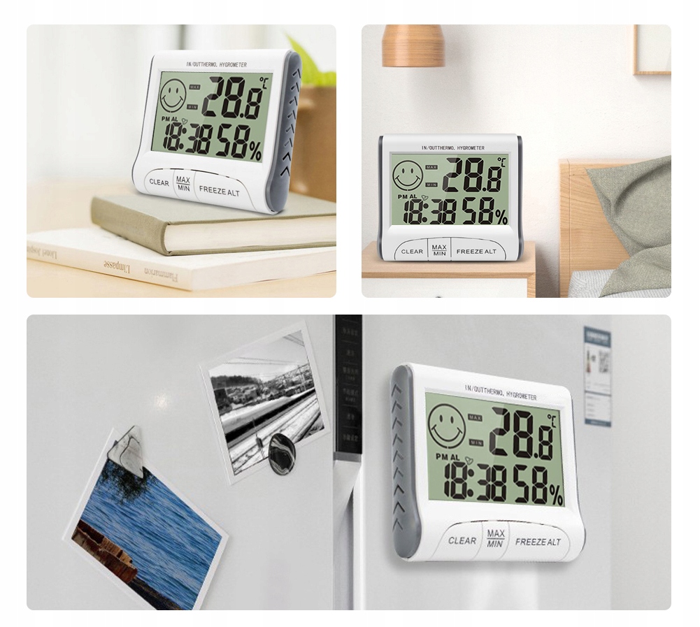 Гігрометр — це точний прилад, який використовується для вимірювання вологості повітря та температури в приміщенні. Крім того, пристрій виконує функцію годинника з будильником. Чіткий дисплей має індикатор теплового комфорту, завдяки якому ви можете швидко перевірити, чи оптимальні температура та вологість у приміщенні.