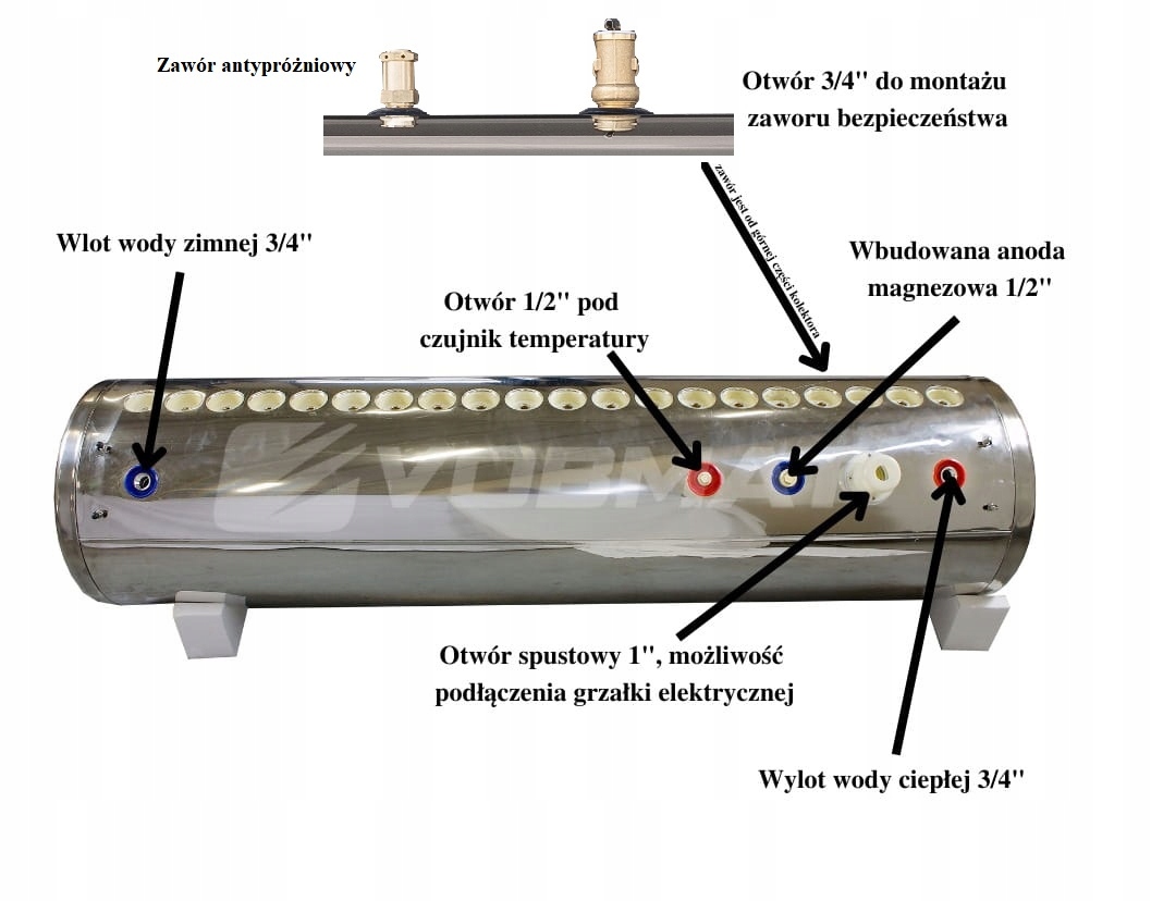- резервуар для води виготовлений з нержавіючої сталі SUS 304-2b 1,2 до 3 мм. Зовнішня ізоляція резервуара виготовлена з висококомплектованої поліуретанової піни з мінімальною товщиною 50 мм. У резервуарі входять технічні отвори, серед інших, для з'єднання та злив води та розетки втулки, в якій ми ковзаємо наконечник (конденсатор) теплової трубки "теплової труби". Кількість рукавів залежить від ємності контейнера. Так є фабрикою, адаптованим для тиску 6 бар. Сіллет. Тепло подальших шарів поглинача полягає у підтримці найбільшу кількість енергії всередині вакуумних труб, запобігаючи їй інфрачервоним випромінюванням. Позбавлений вмісту кисню, який забезпечує довгу і надійну роботу, у внутрішній частині теплової труби, речовина закрита, яка починає кипіти при 25с.