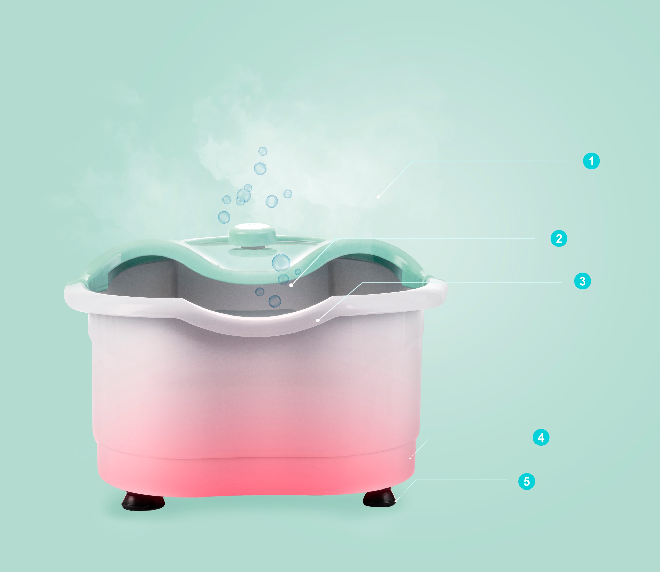 Звичайно, функції вібрації, бульбашок і нагріву додатково стимулюють шкіру та м’язи стопи, розслаблюючи вас після довгого робочого дня підготовка до педикюру чи омолодження шкіри.