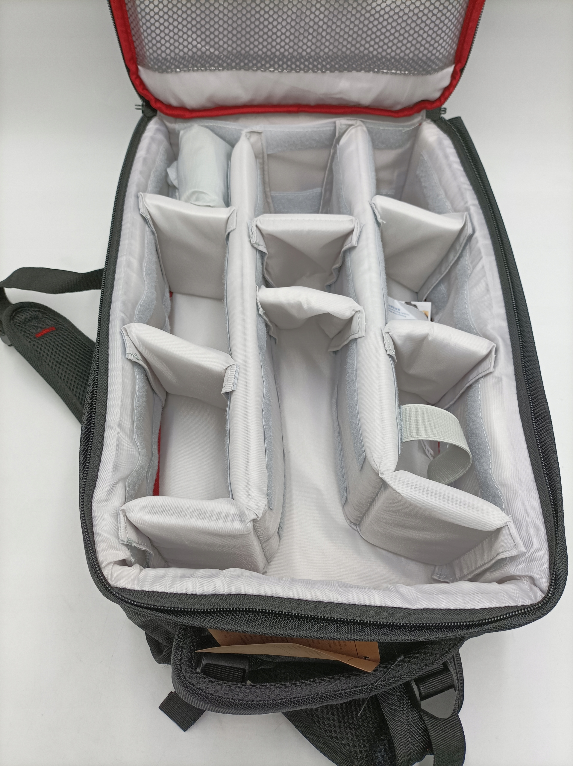 Рюкзак розділений на два окремі сегменти з фотографіями. Змінний внутрішній розподіл за допомогою з’єднань Velcro дозволяє підключати фотообладнання та особисті речі, а підтримка об’єктива гарантує надійне утримання камери. Внутрішнє сітчасте відділення для додаткових аксесуарів.