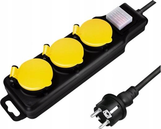 - додаткова інформація: 3 розетки| З вимикачем з підсвічуванням Розетки на 45 градусів | Розетки із запобіжною заслінкою| IP44: захист від проникнення твердих предметів >1 мм і бризок води Сертифікат TÜV і GS | Міцний пластиковий корпус.| Простий плагін| Живлення: 230 В/16 А, 50 Гц, макс Характеристики кабелю: H07RN-F 3G 1,5 мм2| Колір: чорний із жовтими відкидними кришками