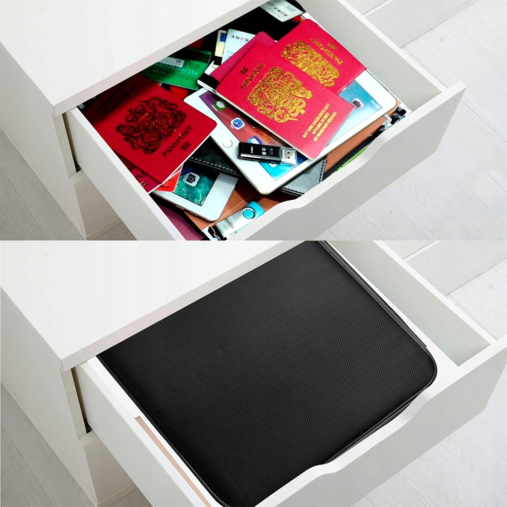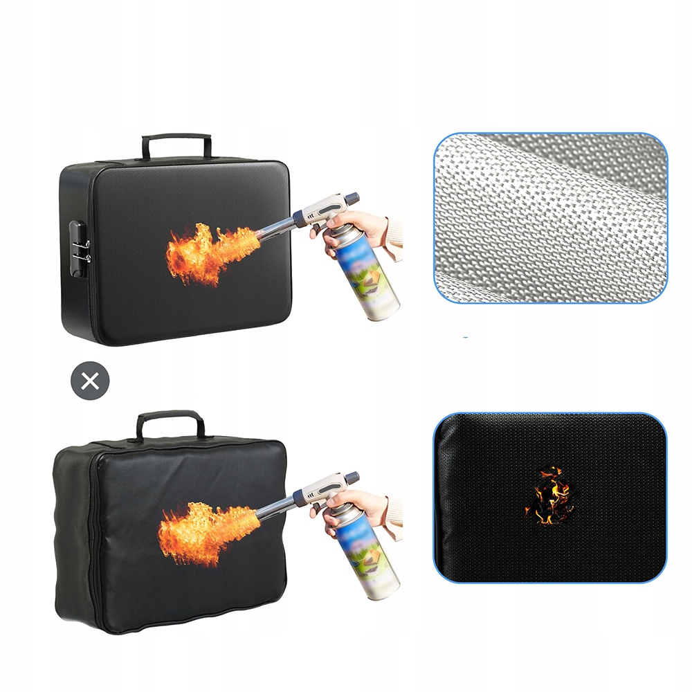 Сумка для документів з алюмінієвої фольги та безшипкового скловолокна, покрита силіконом, витримує температуру до 2700°C. Зовнішній шар стійкий як до вогню, так і до води, що забезпечує повну безпеку предметів, що зберігаються.