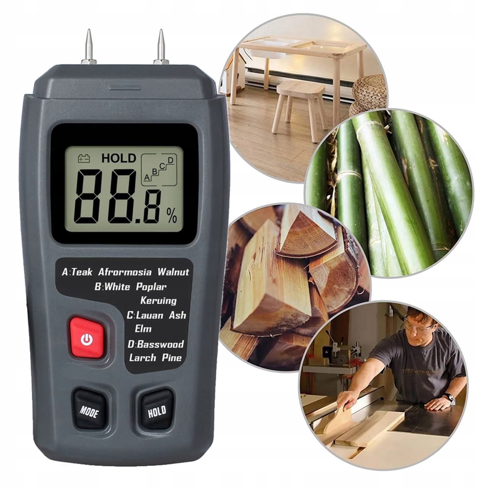 Пропонований лічильник зручнийі простий у використанні. Він допоможе вам швидко і точно виміряти ступінь вологості деревини. Він також може бути використаний для оцінки вологості паркетної підлоги, обшивки або штукатурки стін та інших матеріалів, зокрема: бамбукових виробів b>. Він дозволяє зручно та швидко перевірити вологість дерева за допомогою явища опору.
