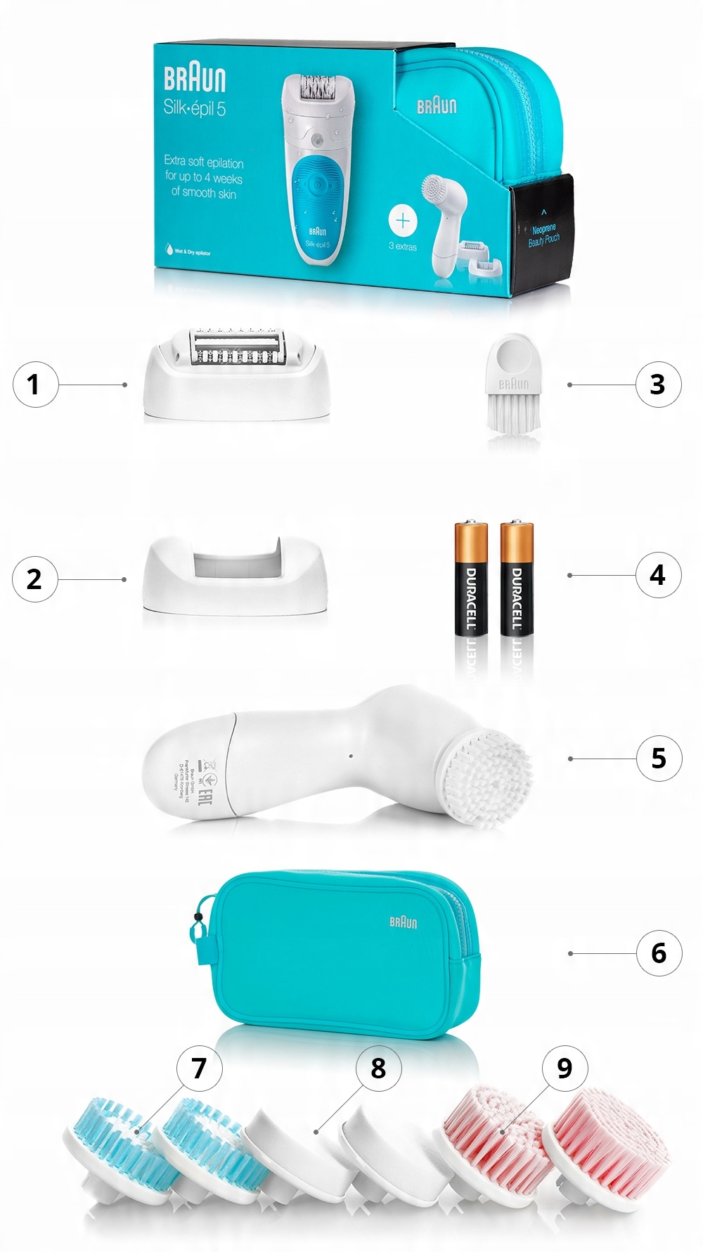 BRAUN Silk-epil 5 ( Wet&Dry ) - Face Limited Edition Pack - можливість депіляції в вода, волога та суха , в наборі з двома насадками, включаючи насадку для масажу, + щітка Braun FaceSpa з додатковими щітками для щоденного використання, для пілінгу, з ультратонкою щетиною та щітка для краси (опис нижче)