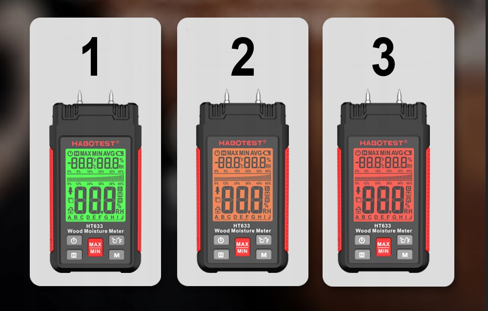 Глюкометр Habotest HT633дозволяє вимірювати як вологість, так і температура навколишнього середовища. Він оснащений 7 режимами вимірювання, які вибираються залежно від типу деревини або матеріалу. Крім того, він дозволяє змінювати °C/°F блоків і автоматично вимикається після певного періоду невикористання з метою економії енергії (цю функцію можна вимкнути).