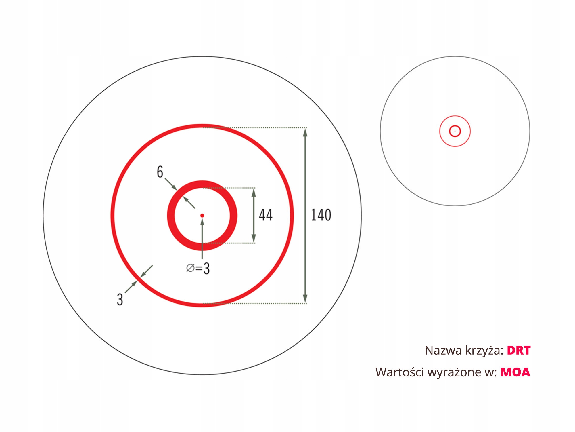 Яскрава пляма з діаметром 2 МОА також впливає на відмінну видимість. Місце дуже чітко видно у кожному світлі, що дозволяє швидко відстежувати ціль і зробити хороший знімок. Можливі зміни освітлення усуваються DRT MOA -high -brown -high -brown -litter прицільна сітка. Сітка додатково оснащена 12 рівнями освітлення, покращуючи видимість під час швидкої зміни освітлення навколишнього середовища.
