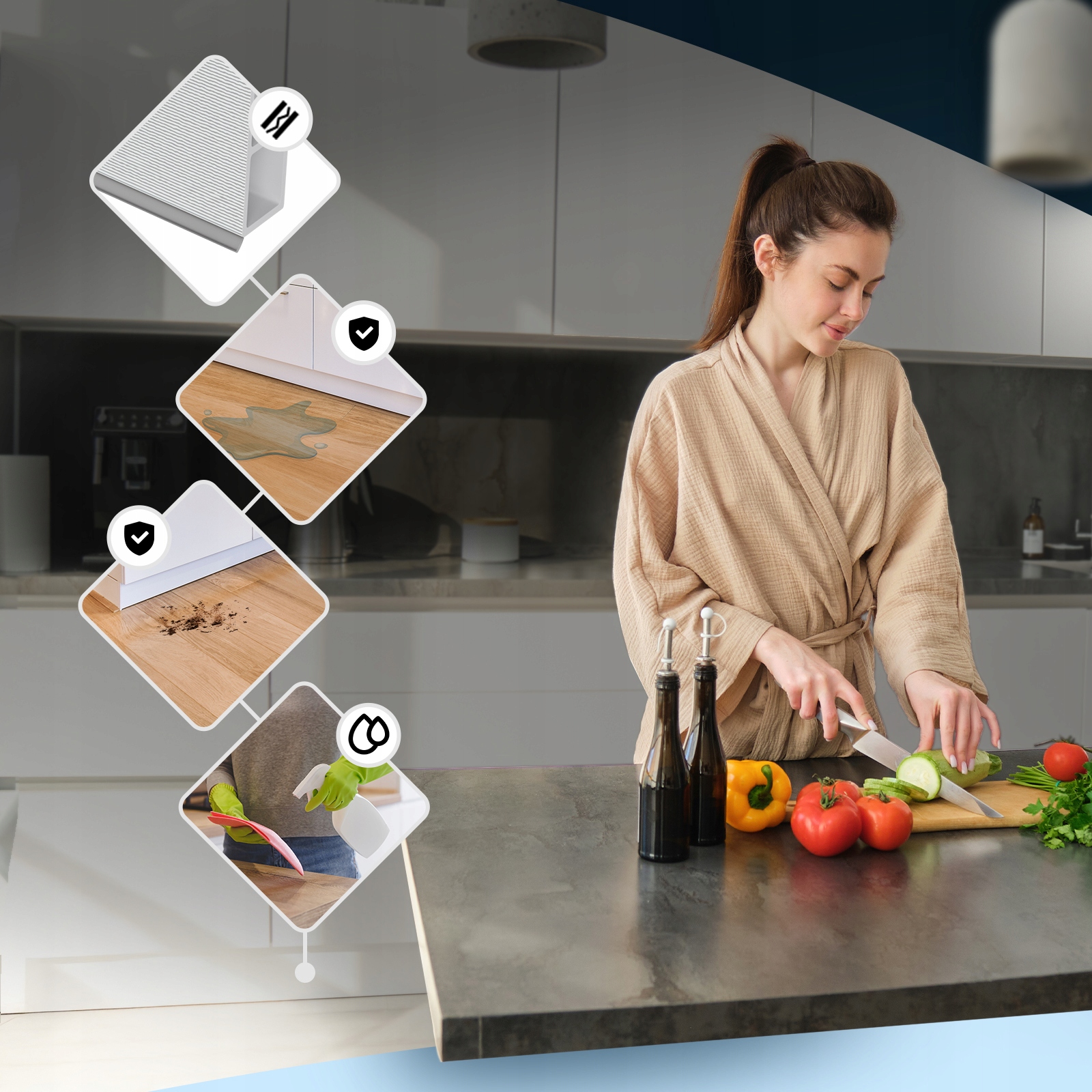 Інноваційна кухонна плінтус була розроблена як цілісна система ідеально відповідних оздоблювальних елементів, які ідеально відповідають. Особливо примітним є універсальний гнучкий кут, що дозволяє з'єднати п’єдестал майже під будь -яким кутом, без необхідності різання або спеціалізованих інструментів.