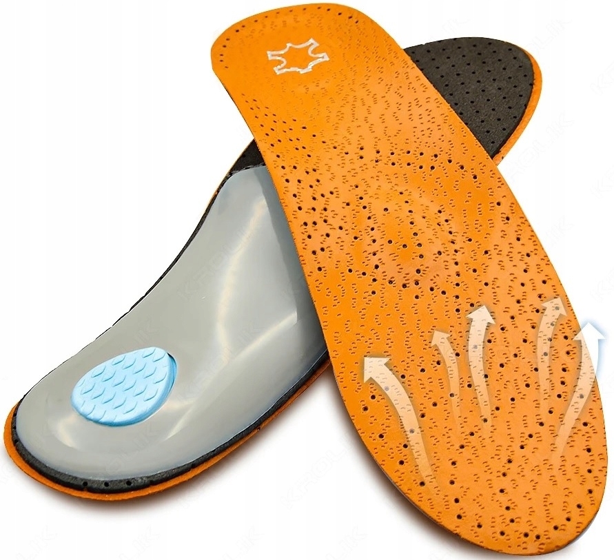 Інноваційні ортопедичні устілки для взуття з підкладкою з натуральної шкіри. Амортизуючий шар ефективно поглинає до 95% ударів, що виникають під час кожного кроку, особливо на твердих поверхнях.