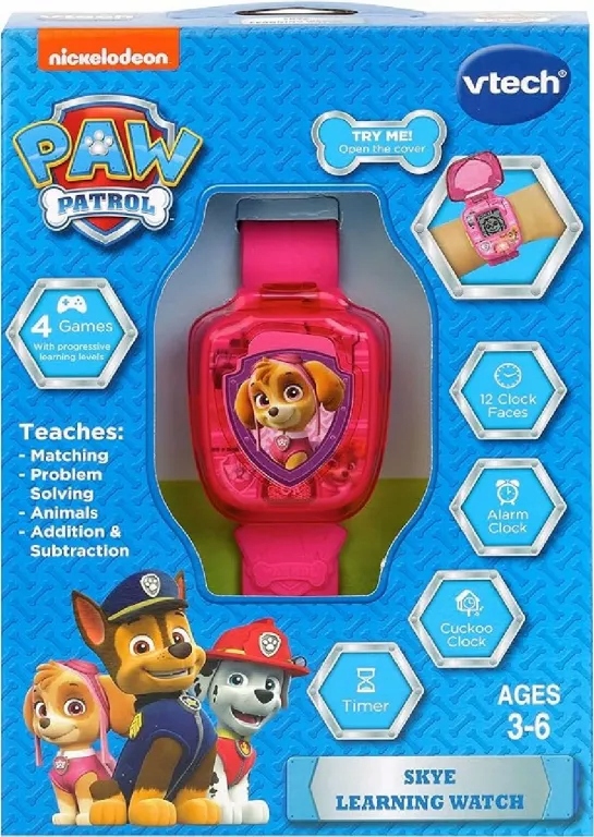 Приєднуйтесь до Skye та рятувальної команди, одягаючи цей кумедний гаджет! Годинник не тільки показує час, але й оснащений функціями тривоги, таймера та секундомір. Він також має 4 вбудовані навчальні ігри.