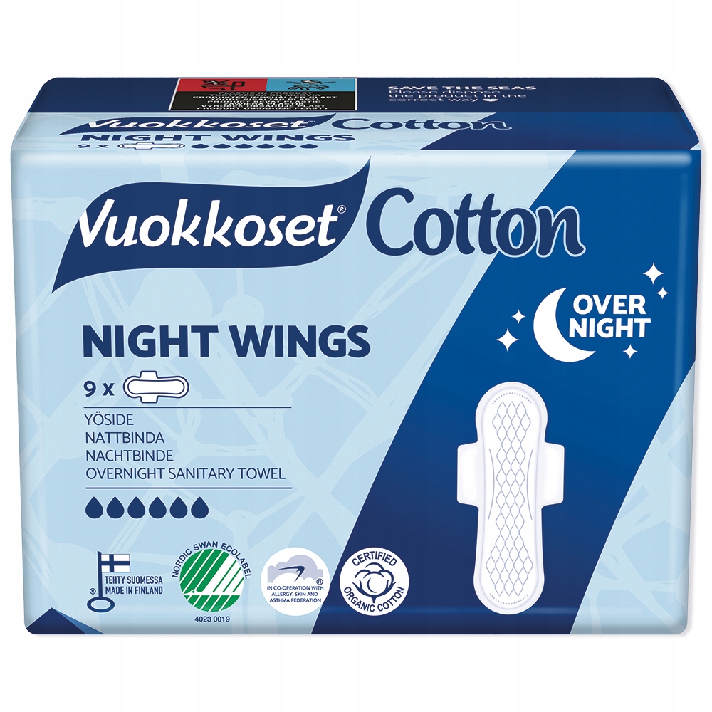 VUOKKOSET БАВОВНА ГІГІЄНІЧНІ ПРОКЛАДКИ З КРИЛАМИ НІЧ