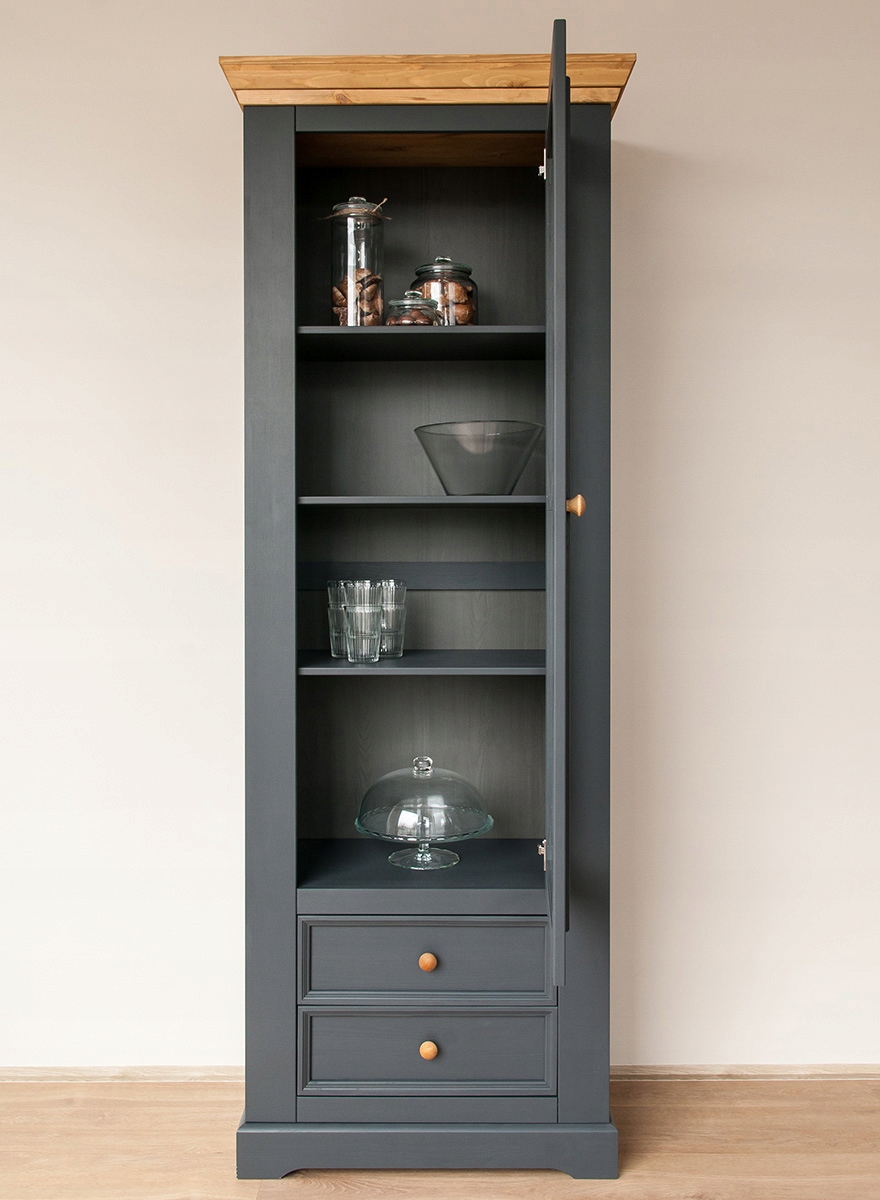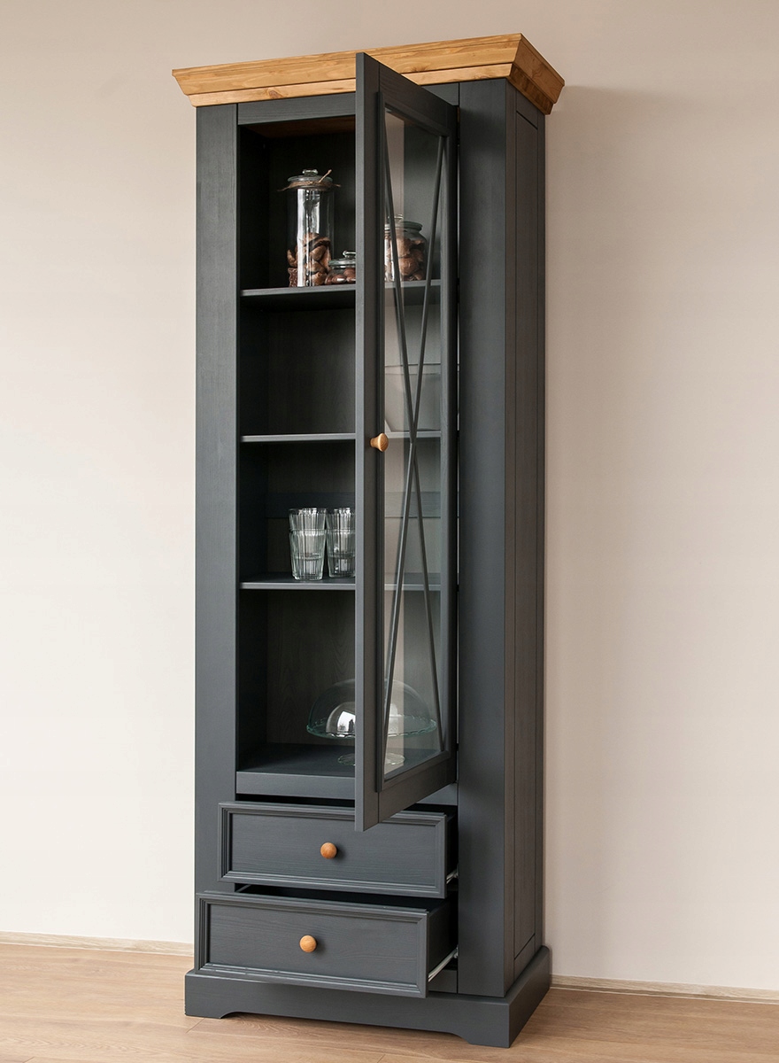 Практичні полиці соснової вітрини, розташовані у верхній частині меблів, є ідеальним місцем для дрібничок, сувенірів або книг. Унизу вітрини, у шухлядах, ви знайдете місце для речей, які не хочете демонструвати.