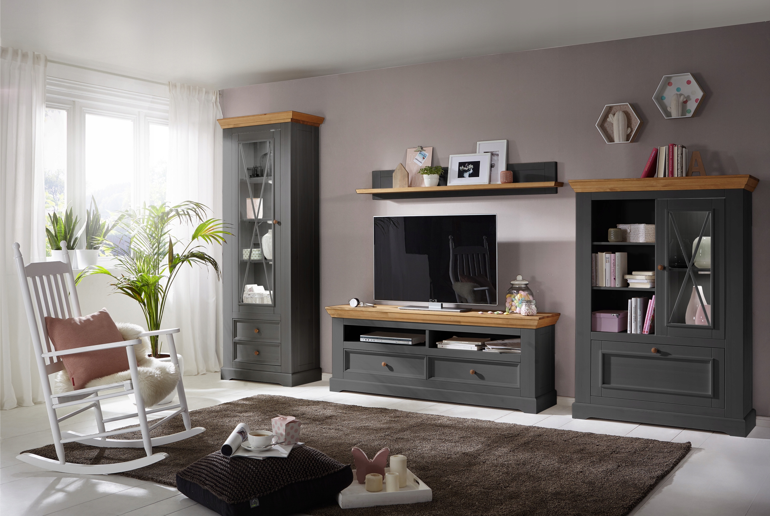 Дерев'яна графітова вітрина виготовлена з масиву сосни. Сільський стиль і стійки - це риси, які відрізняють його від інших меблів, доступних на ринку.